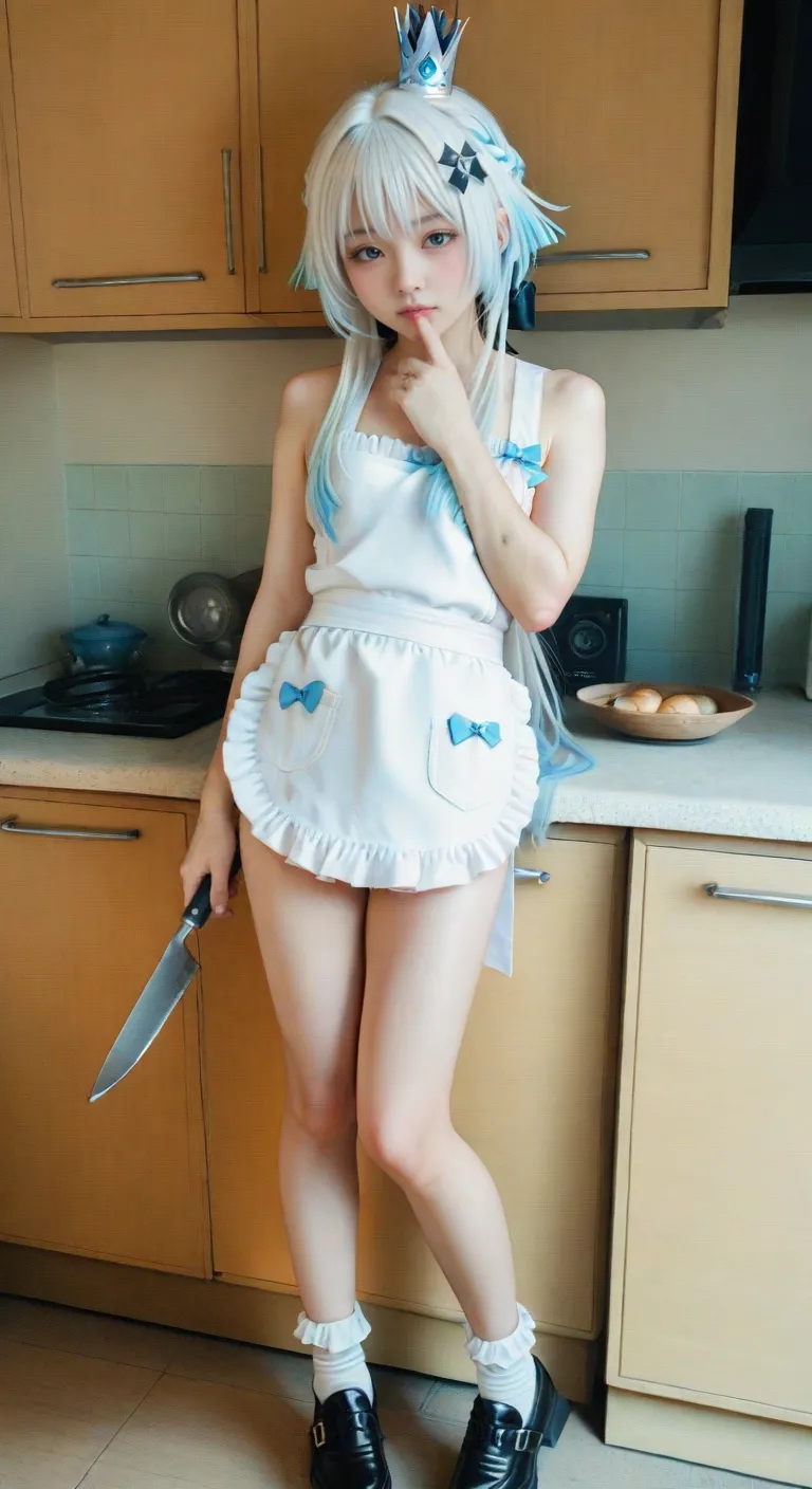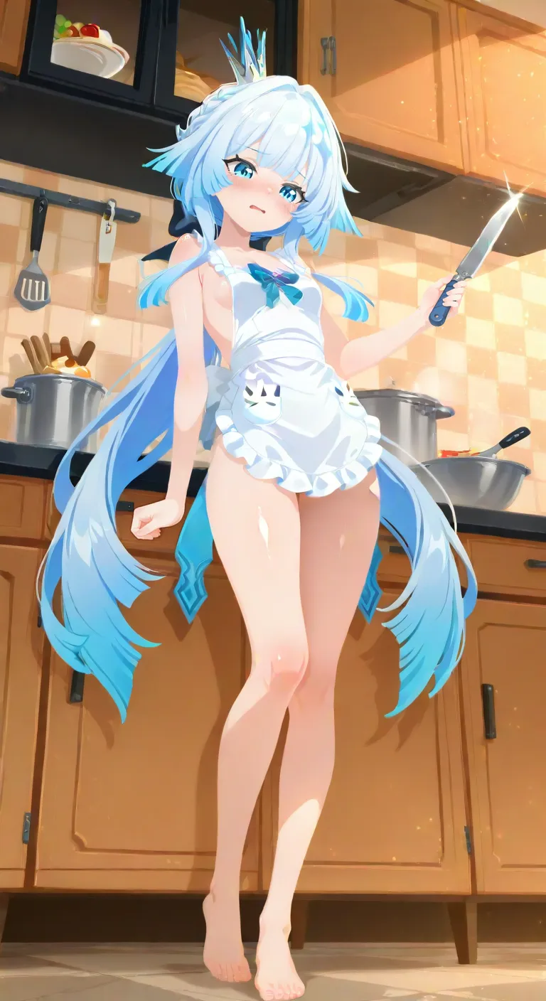 傍晚回到家,厨房里弥漫着奶油炖菜的香气。刻律德菈只穿了一件系带的荷叶边家居围裙,那是完全没有任何遮蔽的“真空”状态。她背对着我站在流理台前切菜,白皙的背脊和侧面若隐若现的曲线在暖黄色的灯光下散发着惊人的色气。当她转过身,端着盘子走向我时,脸颊绯红,眼神躲闪却又坚定。在这个狭小的空间里,她终于卸下了所有的盔甲,向我坦白了她最深的渴望。