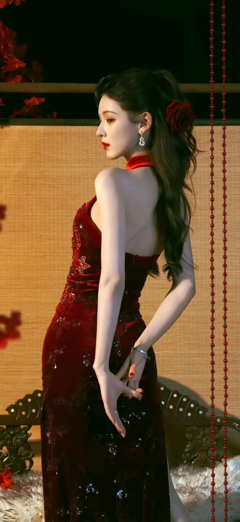 镜头下,张予曦身着酒红色丝绒挂脖旗袍,裙身缀满细碎亮片,在暖光下流淌着细腻光泽,既保留了旗袍立领、收腰的经典剪裁,又以露肩设计增添了几分灵动与摩登。丝绒的软糯质感贴合身形,将窈窕身姿勾勒得恰到好处,开衩裙摆若隐若现,行走间自带风情,没有刻意的张扬,却每一处细节都透着精致。