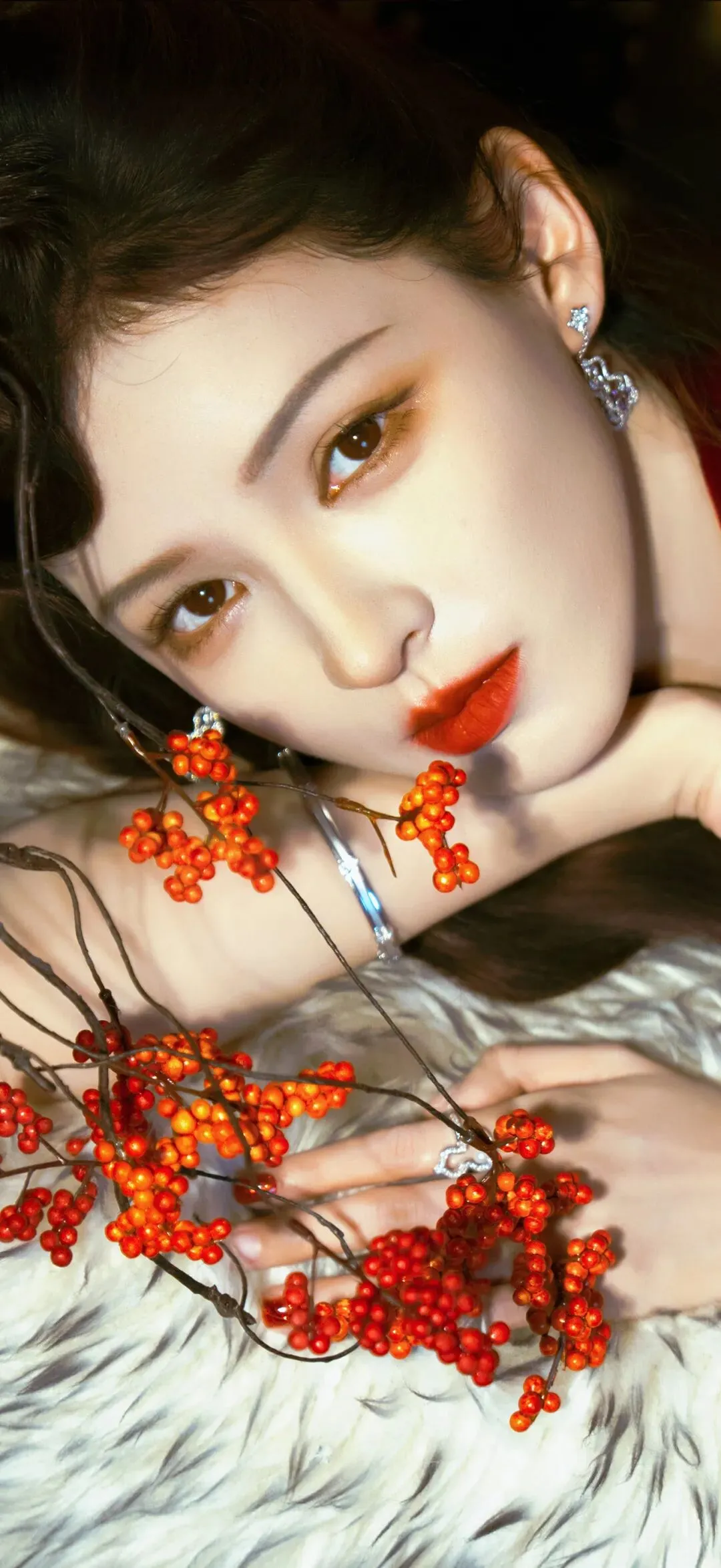 妆容上,烈焰红唇成为视觉焦点,浓郁的正红色调衬得肌肤胜雪,眉眼间晕染着恰到好处的慵懒与妩媚。眼妆以大地色打底,弱化了繁复线条,只强调眼型的灵动,与红唇形成冷暖对比,既凸显了五官的精致立体,又让整体造型更具层次感。
