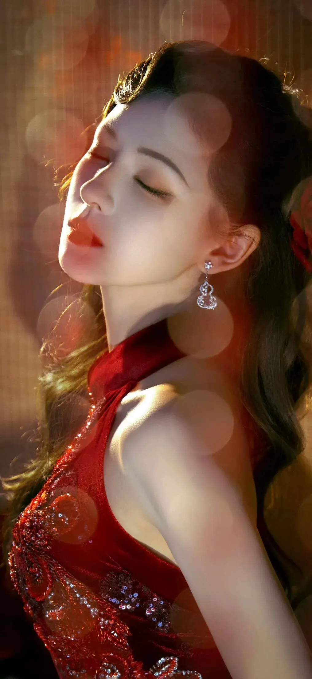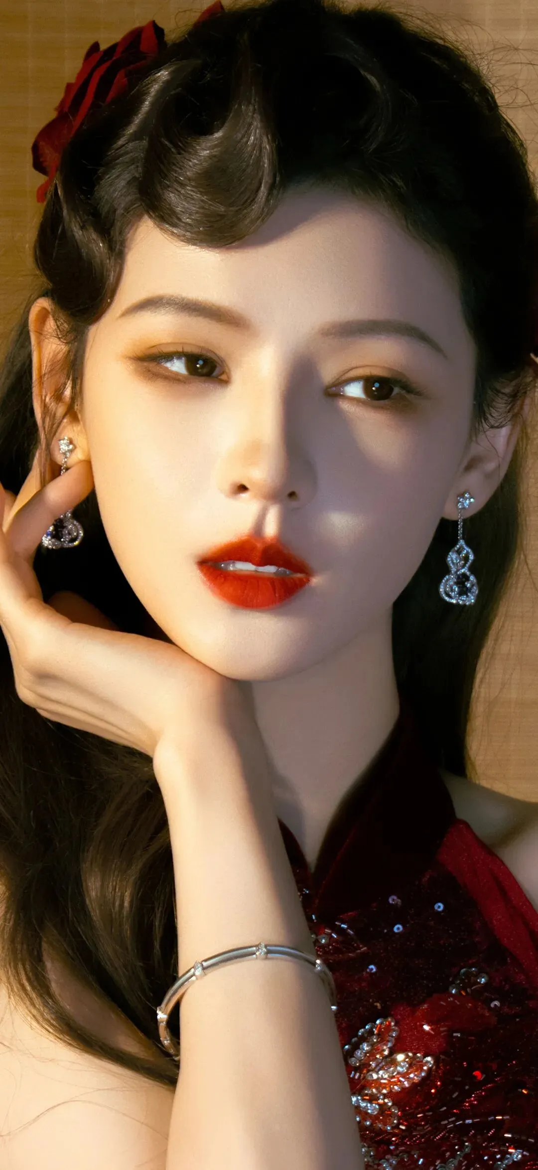 发丝或慵懒垂落,或挽起搭配红色玫瑰发饰,与红裙相得益彰,耳畔的碎钻耳饰点缀其间,低调中透着华贵。