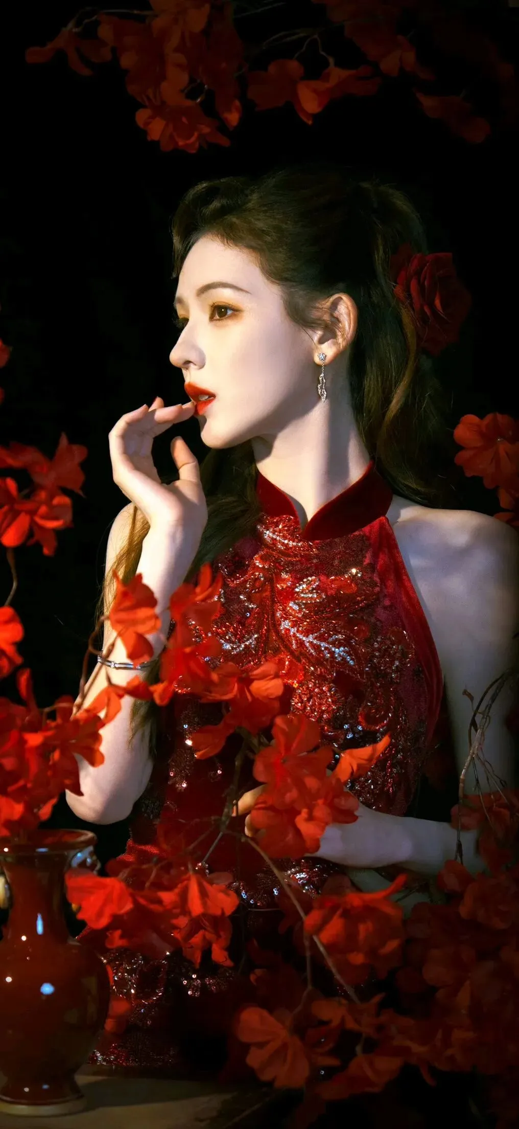 或侧身伫立,抬手轻触红珠帘,眼神清冷又疏离,自带清冷破碎感;或回眸浅笑,眉眼弯弯,将温婉与明艳完美融合;或闭眼轻嗅花香,侧脸线条流畅优美,光影在脸颊晕开,宛如从画中走出的古典佳人。