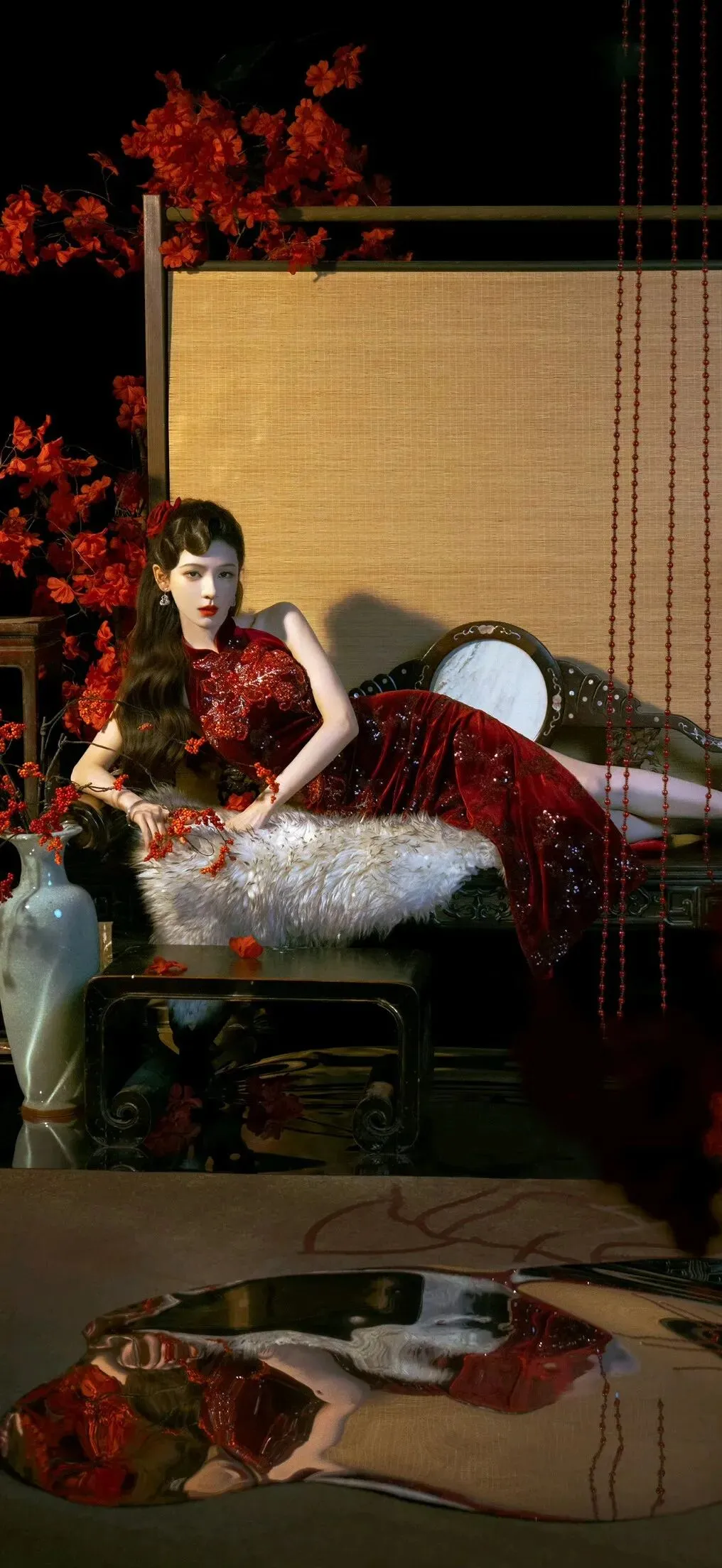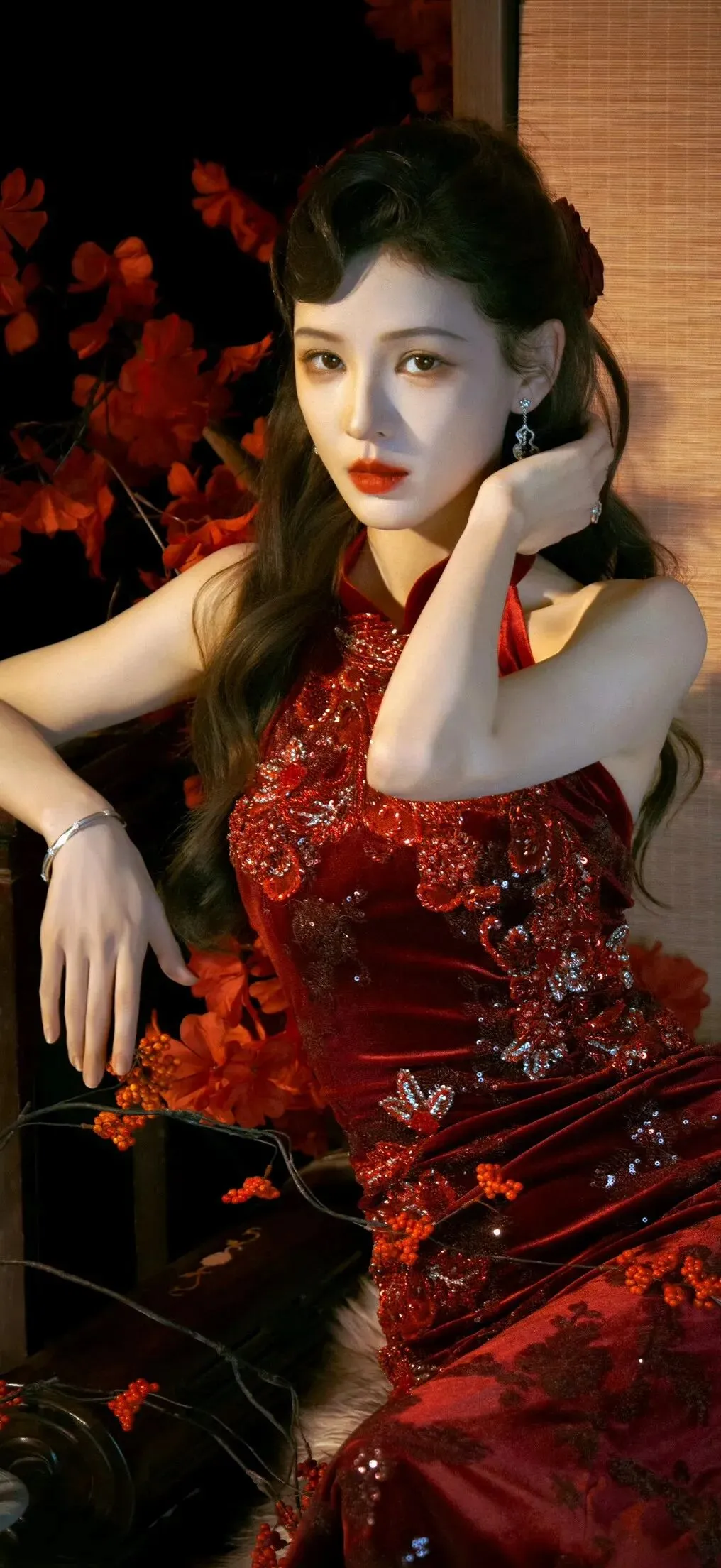 写真|张予曦红丝绒旗袍写真释出,红唇明艳勾勒东方韵致,每一帧都是壁纸级美学