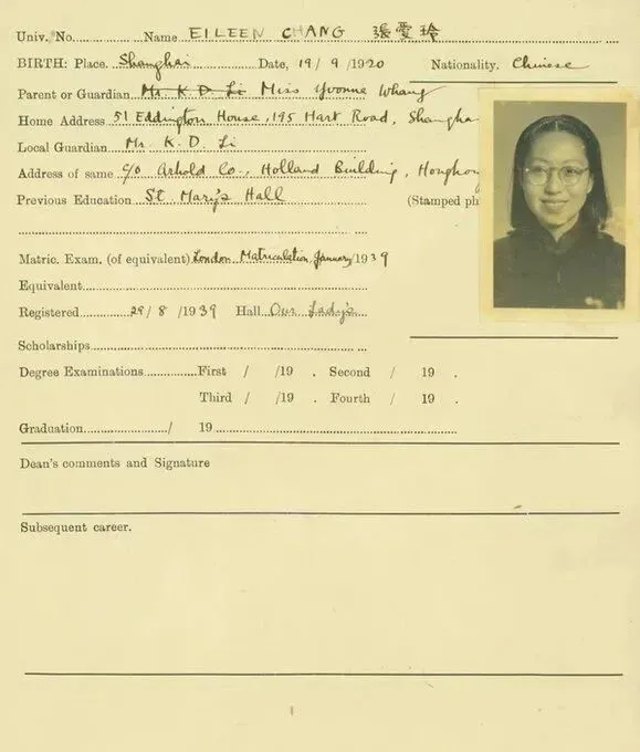 张爱玲在香港大学的注册信息