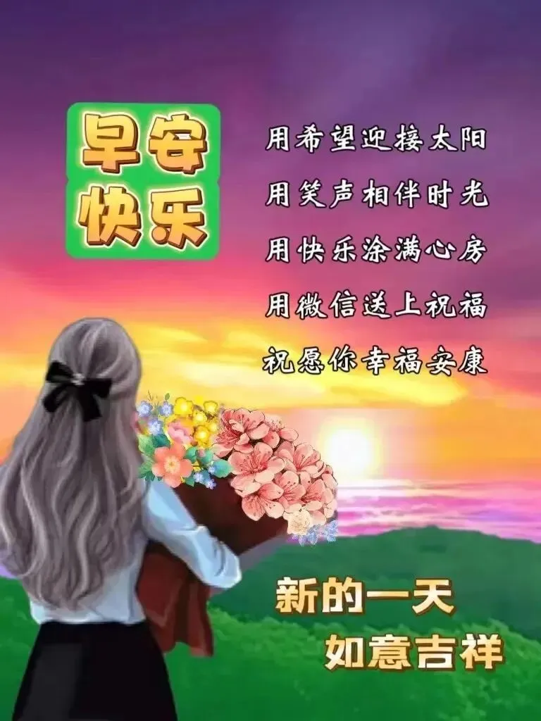 4,让美好的今天,带给你满满的幸福与快乐!让清晨的问候,带给你永远的平安与健康!新的一天阳光灿烂,带上你的好心情,向快乐出发!大家早安吉祥!福满全群!