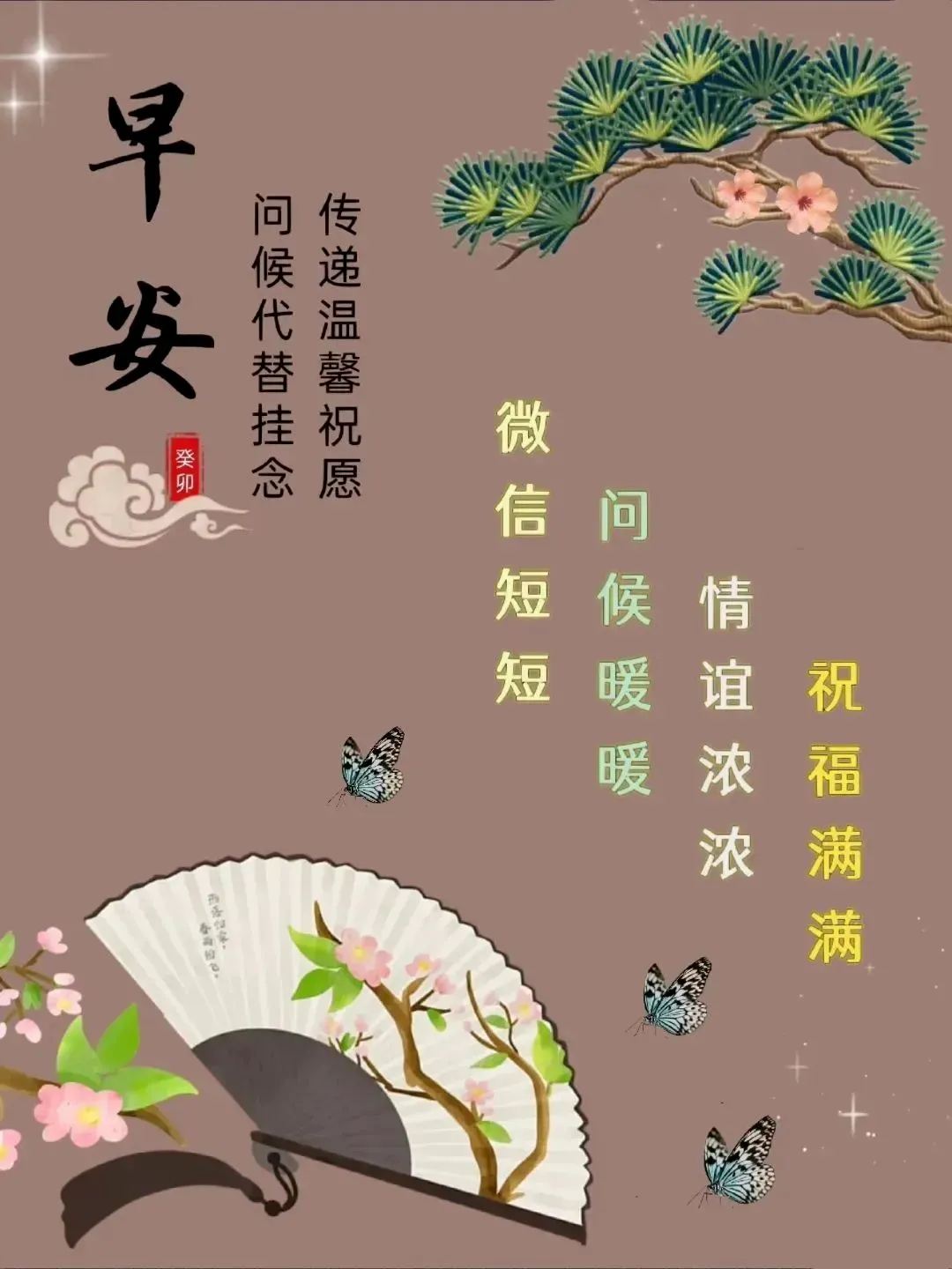 1、静静地行走,慢慢地生活,把窗户打开,让春光照进来;把心灵打开,让春风吹进来;把日子打开,让幸福钻进来;把手机打开,让祝福蹦出来。一年之计在于春,一天之计在于晨,早安,朋友,愿你把握大好时光,心想事成。