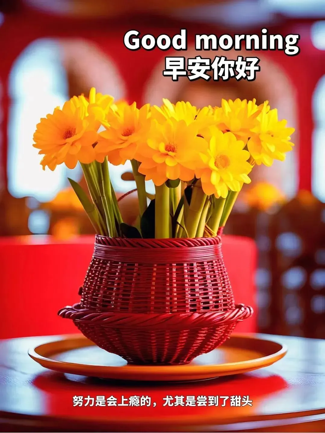 13、早安!在这热情似火的清晨,祝你心想事成,愿你的每一个愿望都能现,每一个目标都能达成。万事如意,生活顺心,每天都有新的惊喜和快乐。早上好!