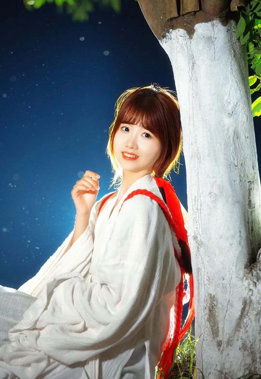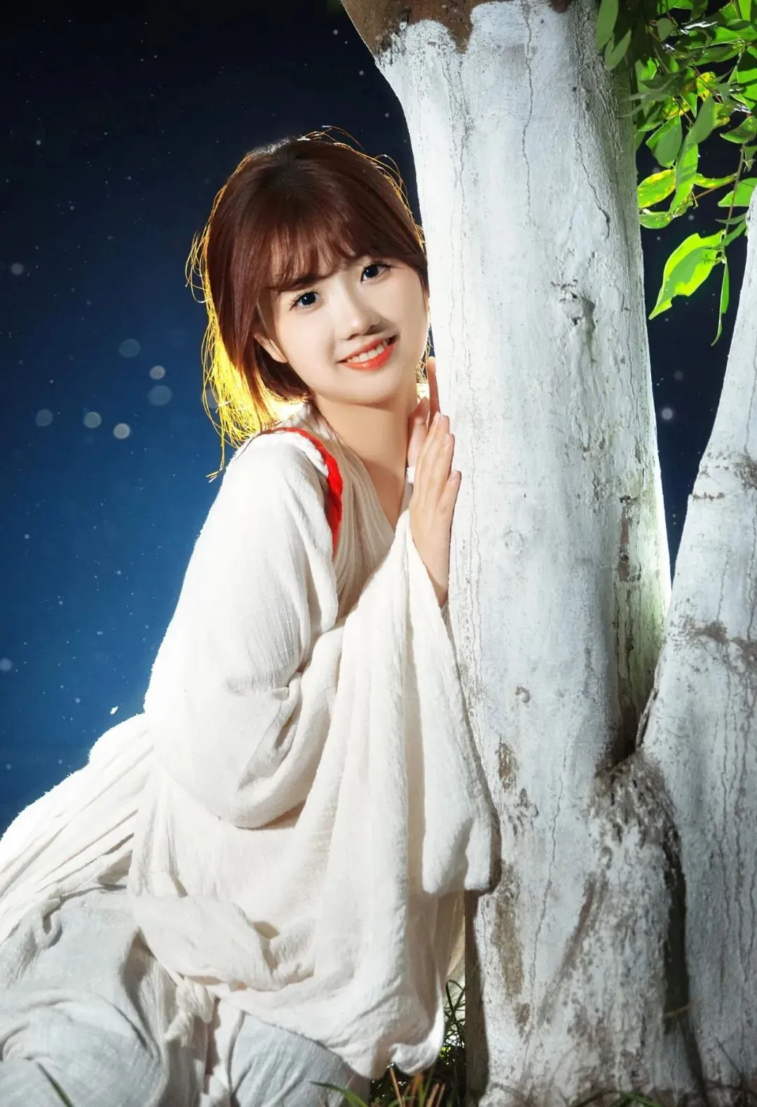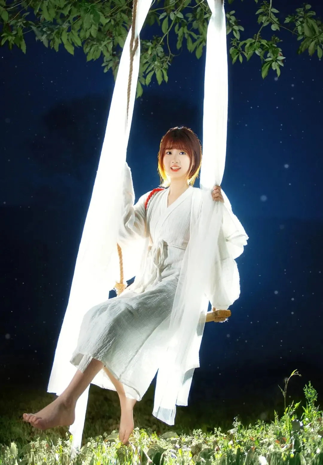 在幽深的夜幕之下,繁星如细碎的钻石镶嵌于深邃的天幕,仿佛在静静诉说着宇宙的神秘故事。此时,一位身着白色长袍的女子,轻盈地坐在秋千之上,宛如从梦幻中走来的精灵,为这静谧的夜晚增添了一抹空灵与浪漫。她的白色长袍,质地轻柔,似云雾般飘逸。宽大的衣袖随风微动,仿佛在与夜风低语。长袍的腰间束着简约的腰带,勾勒出她纤细的身姿。她赤着双脚,自然地垂落在秋千一侧,脚踝线条优美,透着一种未经雕琢的纯真。她的双手,轻轻握住秋千两侧的白色布条,布条在夜风中轻轻飘动,宛如灵动的羽翼。秋千悬挂在树枝之上,树枝的轮廓在夜色中若隐若现,几片绿叶探出头来,为画面增添了一丝生机。秋千下方,是一片绿意盎然的草地,草地上点缀着星星点点的白色小花,在微弱的光线下,宛如夜空洒落的繁星,与天上的星辰相互呼应。女子面带微笑,眼神温柔而明亮,仿佛藏着整个宇宙的温柔。那笑容,纯净而美好,如同春日里绽放的第一朵花,能驱散世间所有的阴霾。她的目光,或许正凝视着远方闪烁的星辰,沉浸在无尽的遐想之中;又或许,她正享受着这片刻的宁静与自由,忘却了尘世的纷扰。