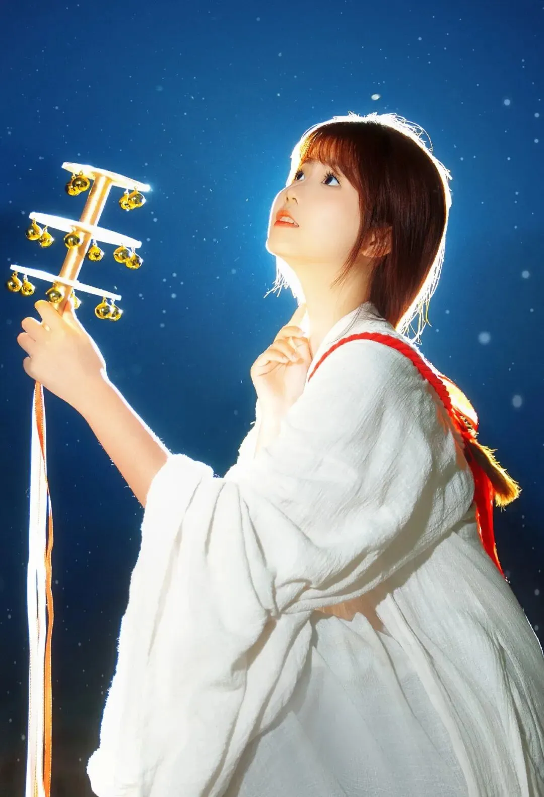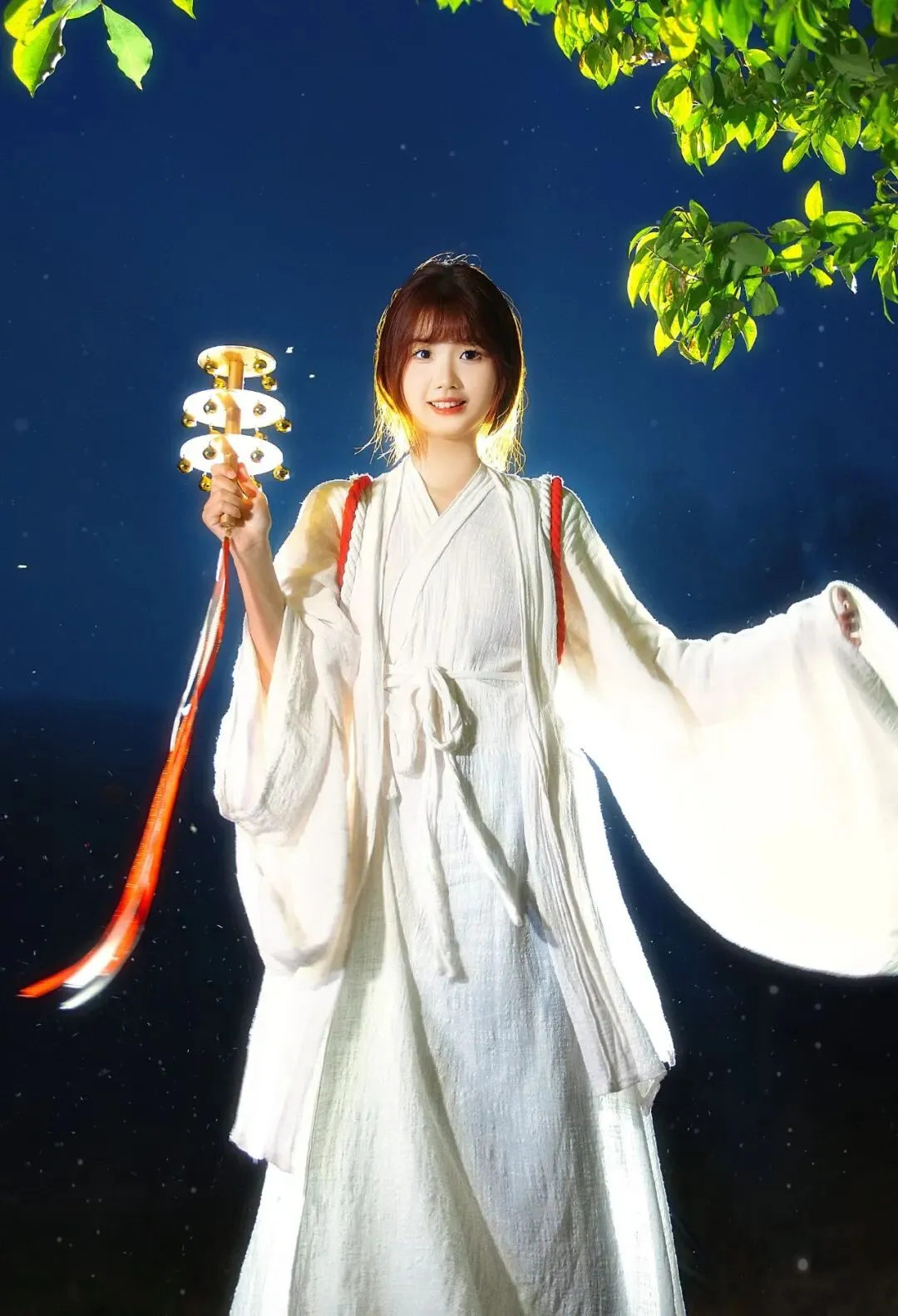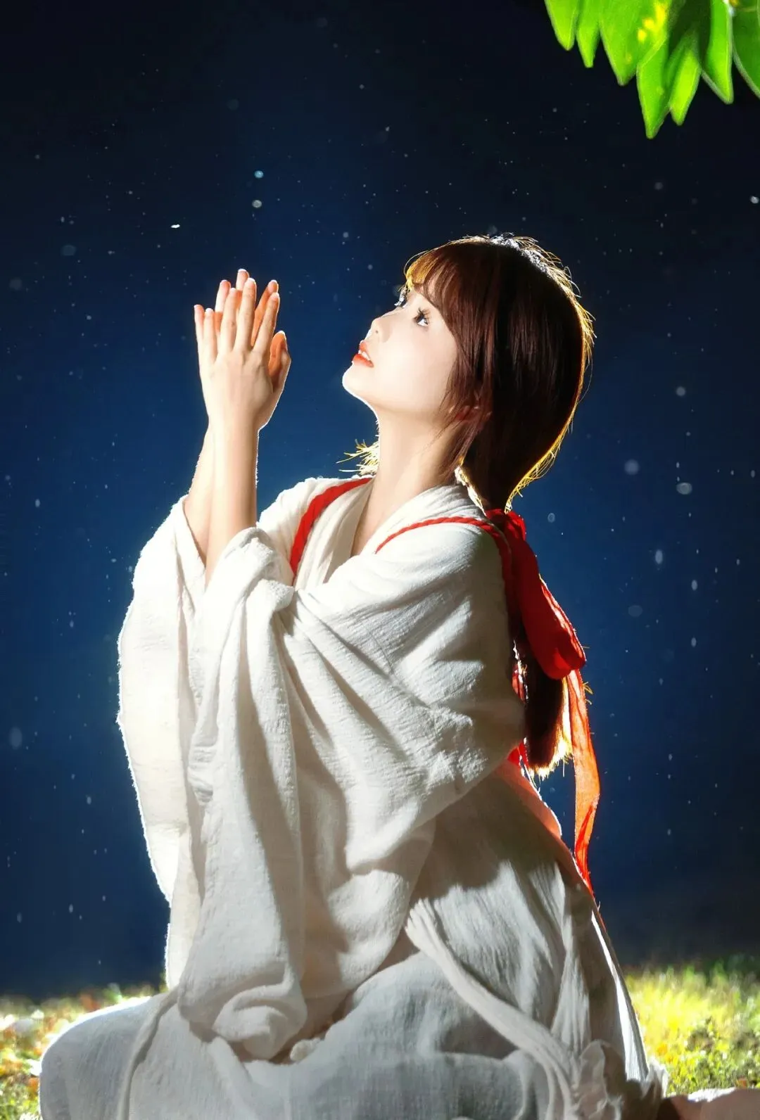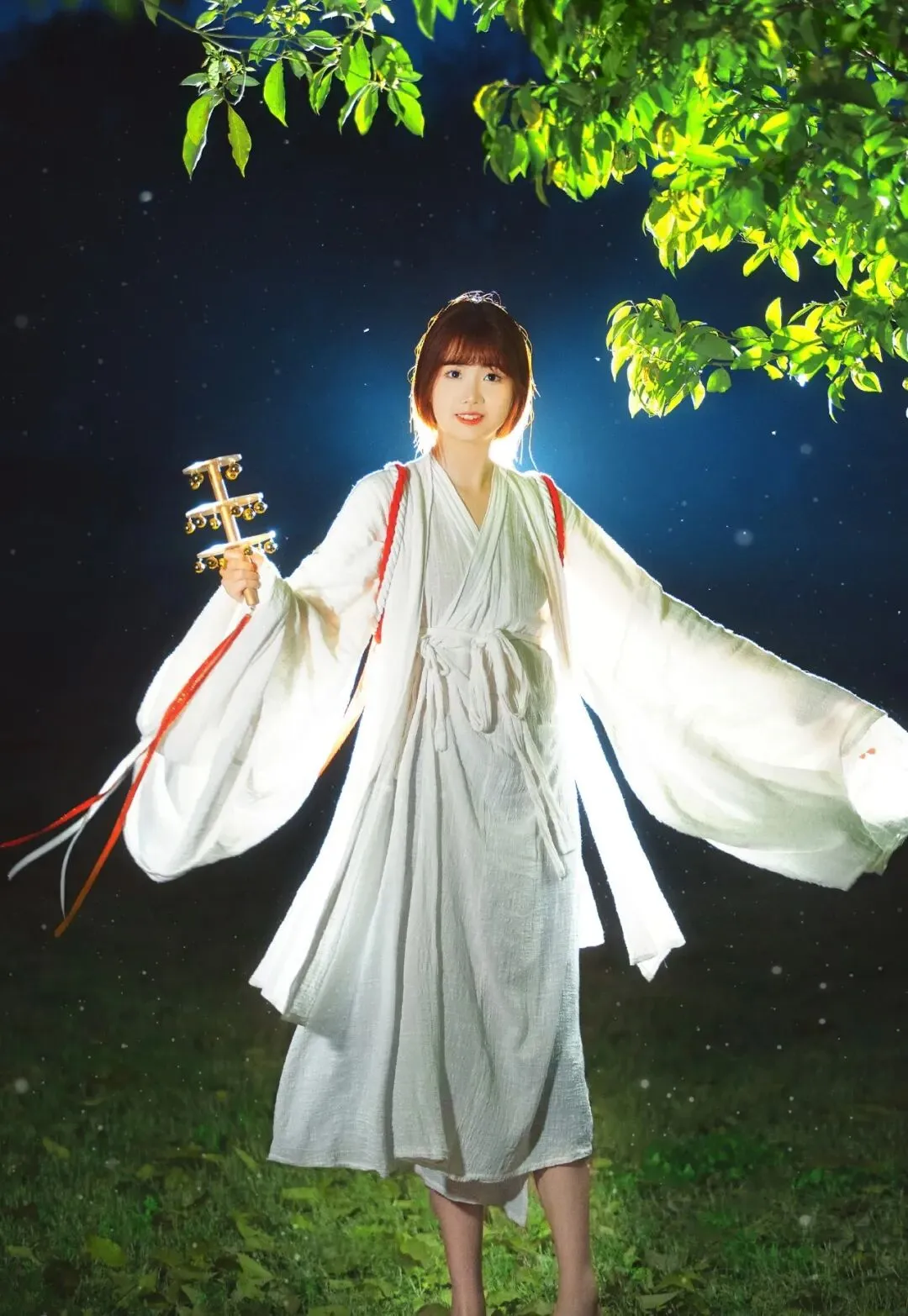 在幽深的夜幕之下,繁星如细碎的钻石镶嵌于深邃的天幕,仿佛在静静诉说着宇宙的神秘故事。此时,一位身着白色长袍的女子,轻盈地坐在秋千之上,宛如从梦幻中走来的精灵,为这静谧的夜晚增添了一抹空灵与浪漫。她的白色长袍,质地轻柔,似云雾般飘逸。宽大的衣袖随风微动,仿佛在与夜风低语。长袍的腰间束着简约的腰带,勾勒出她纤细的身姿。她赤着双脚,自然地垂落在秋千一侧,脚踝线条优美,透着一种未经雕琢的纯真。她的双手,轻轻握住秋千两侧的白色布条,布条在夜风中轻轻飘动,宛如灵动的羽翼。秋千悬挂在树枝之上,树枝的轮廓在夜色中若隐若现,几片绿叶探出头来,为画面增添了一丝生机。秋千下方,是一片绿意盎然的草地,草地上点缀着星星点点的白色小花,在微弱的光线下,宛如夜空洒落的繁星,与天上的星辰相互呼应。女子面带微笑,眼神温柔而明亮,仿佛藏着整个宇宙的温柔。那笑容,纯净而美好,如同春日里绽放的第一朵花,能驱散世间所有的阴霾。她的目光,或许正凝视着远方闪烁的星辰,沉浸在无尽的遐想之中;又或许,她正享受着这片刻的宁静与自由,忘却了尘世的纷扰。