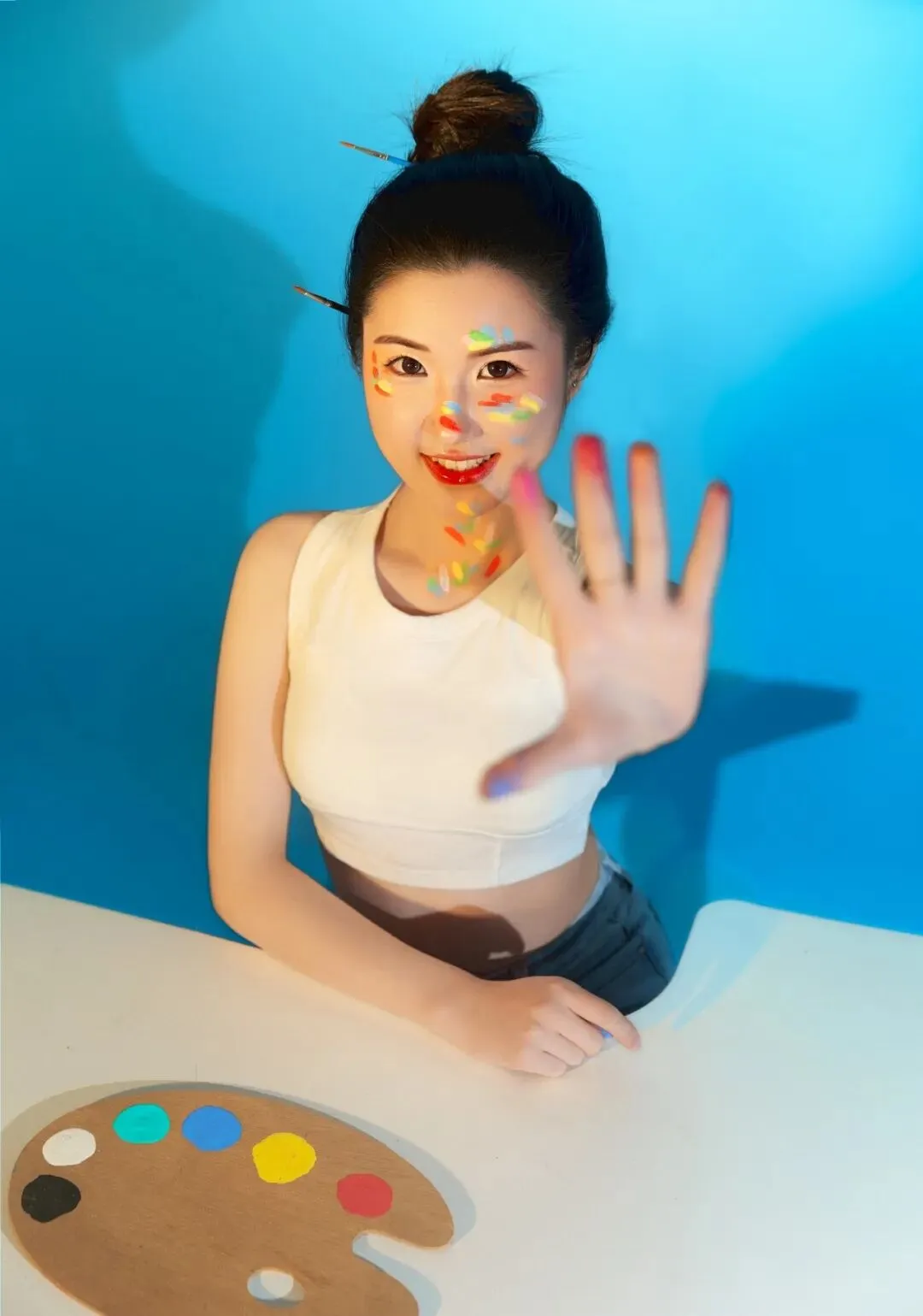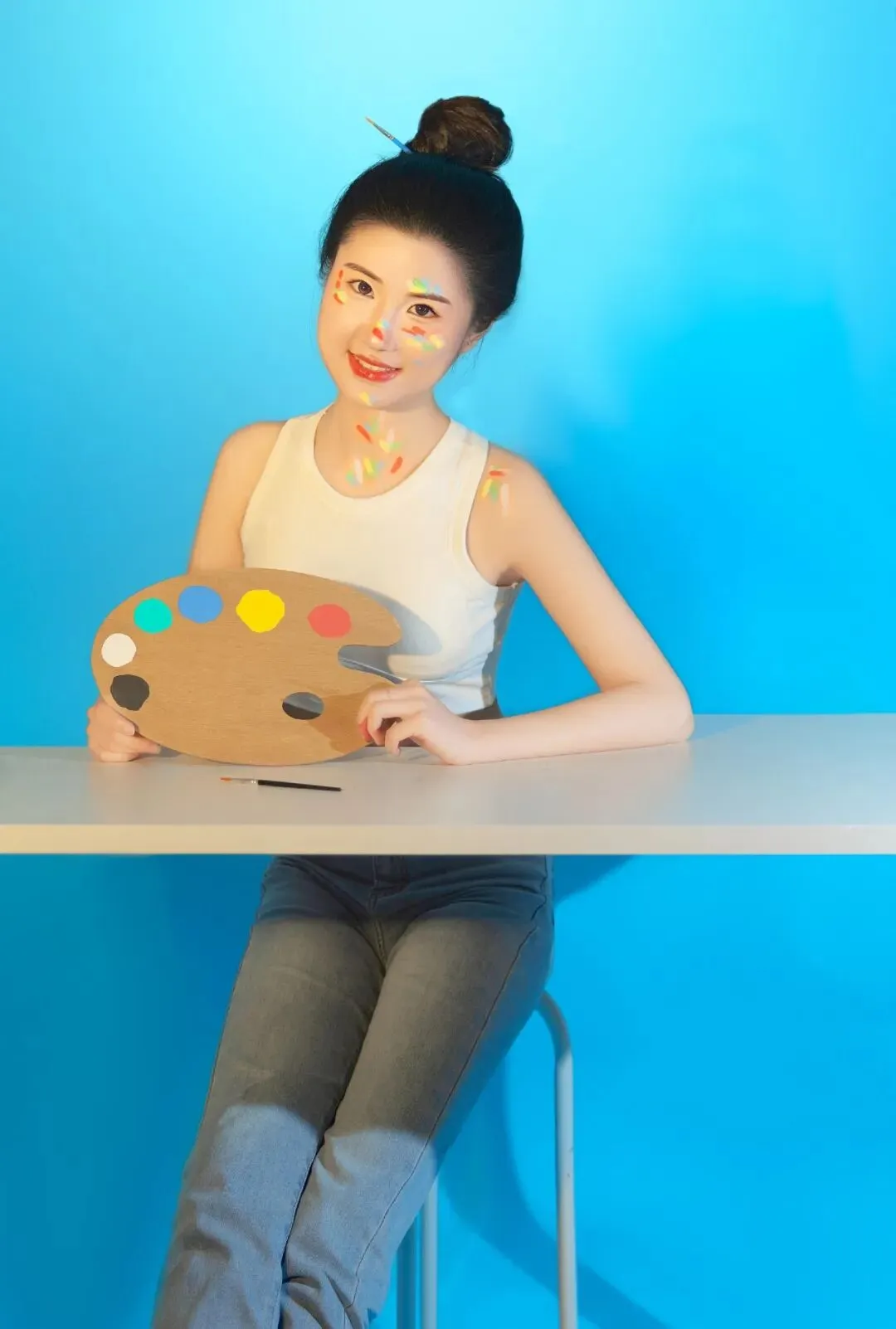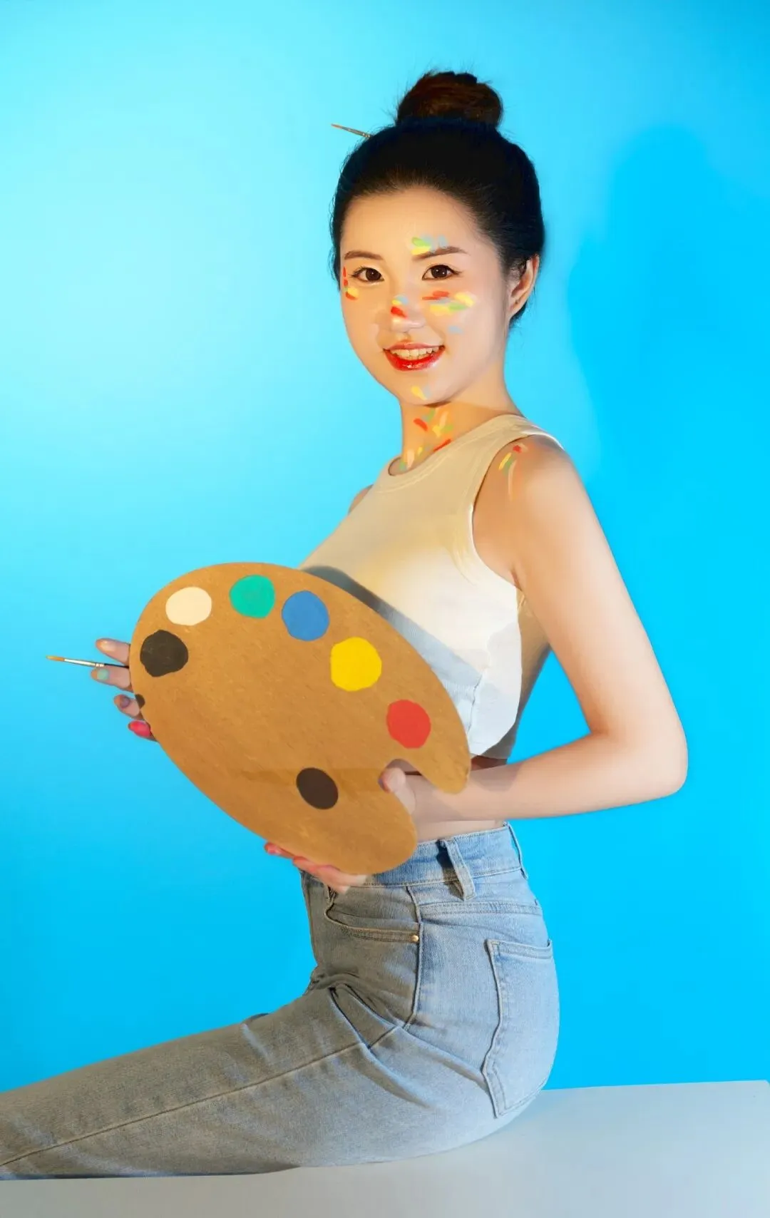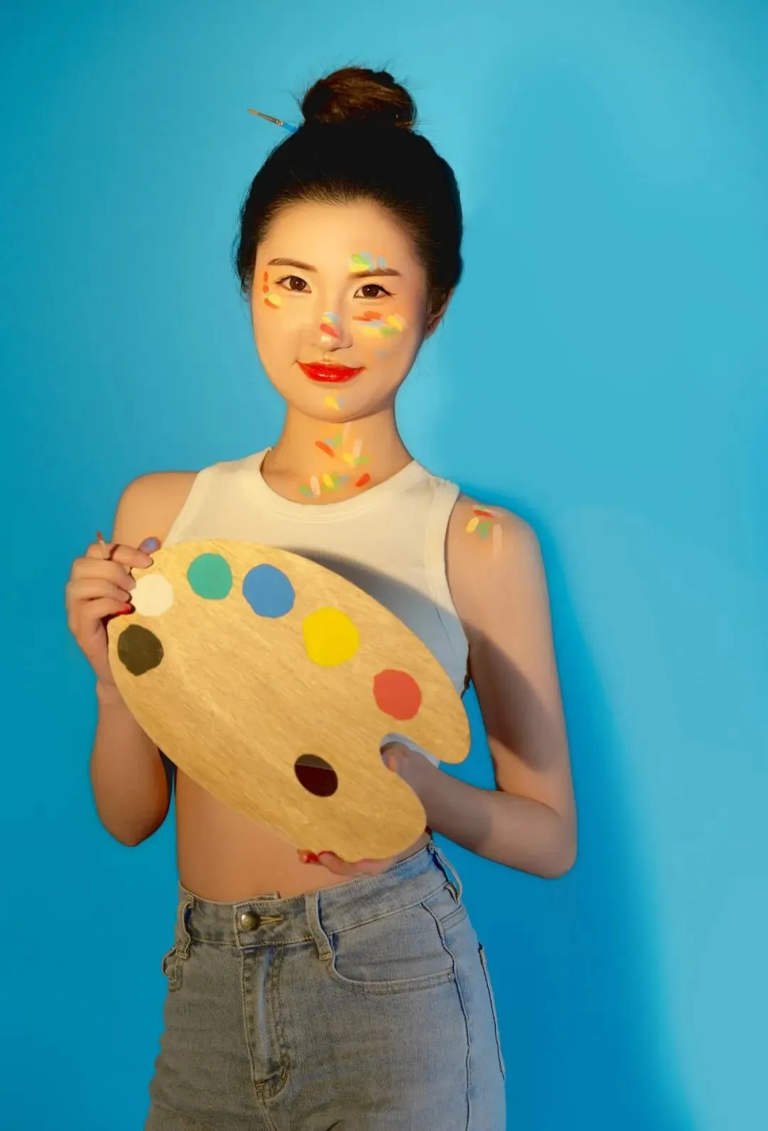 在艺术的浩瀚宇宙中,绘画是一颗璀璨的星辰,它以独特的魅力吸引着无数人投身其中,用色彩和线条描绘出内心的世界。今天,我们要认识一位怀揣着艺术梦想的年轻创作者,她手持调色板,笑容灿烂,仿佛在向我们诉说着绘画给她带来的无尽快乐与力量。画面中的女孩,将头发高高盘起,显得干练又充满活力。她身着简约的白色背心和浅蓝色牛仔裤,自然清新的装扮与她手中的调色板相得益彰。调色板上,红、黄、蓝、绿、黑、白等各种颜色的颜料整齐排列,仿佛是一扇通往多彩世界的大门。她的脸上沾染着星星点点的颜料,这看似不经意的点缀,却成为了她独特的“妆容”,彰显着她沉浸于创作时的专注与投入。绘画,对于她来说,不仅仅是一种技艺,更是一种情感的宣泄和心灵的对话。当她拿起画笔,蘸上颜料,在画布上轻轻挥洒时,仿佛整个世界都安静了下来。每一笔的勾勒,每一抹色彩的涂抹,都是她内心深处情感的表达。也许是一抹明亮的黄色,代表着她心中的阳光与希望;也许是一抹深沉的蓝色,诉说着她偶尔的沉思与忧郁。绘画成为了她与世界沟通的桥梁,让她能够将自己的喜怒哀乐毫无保留地展现在画布之上。
