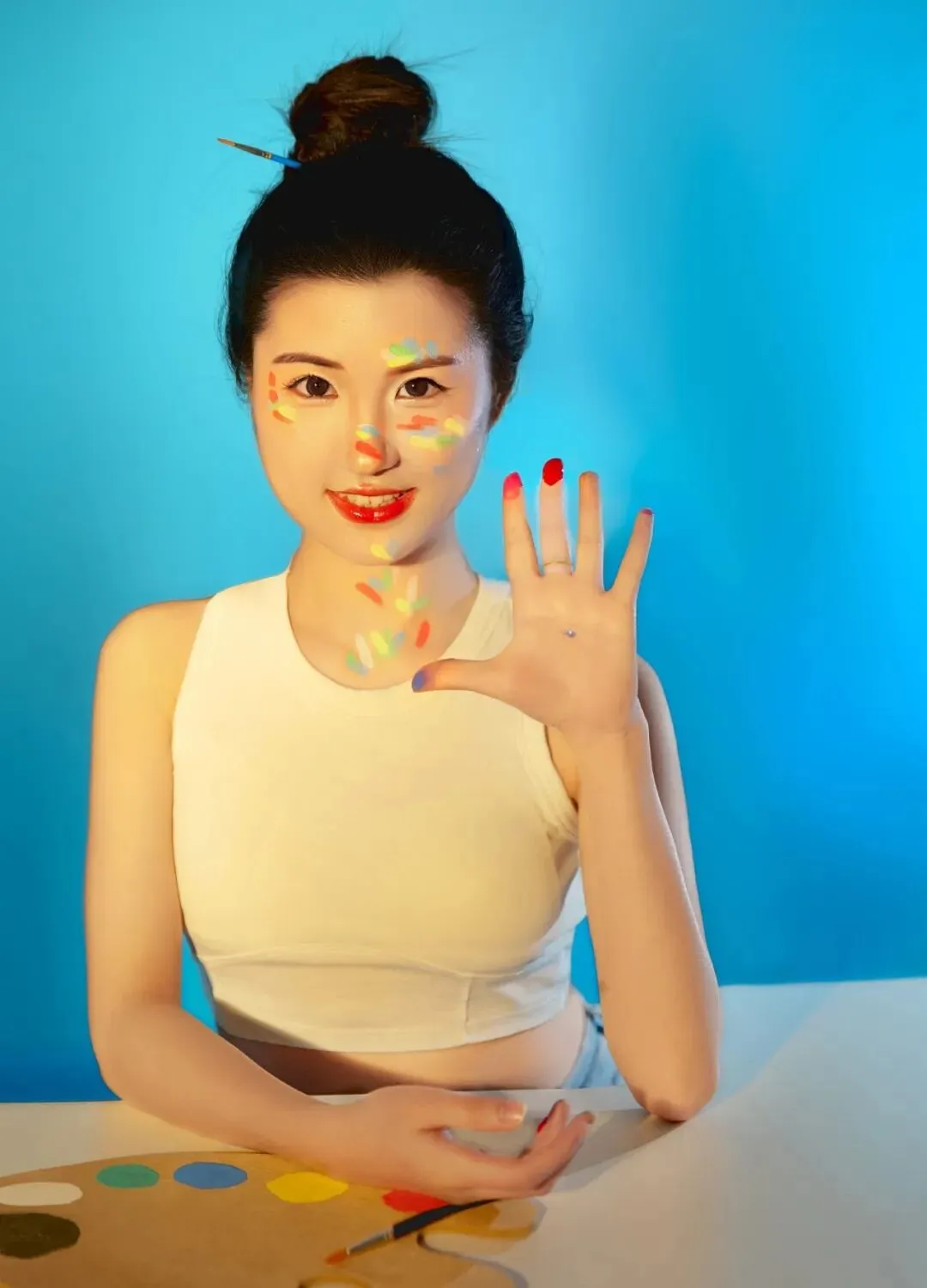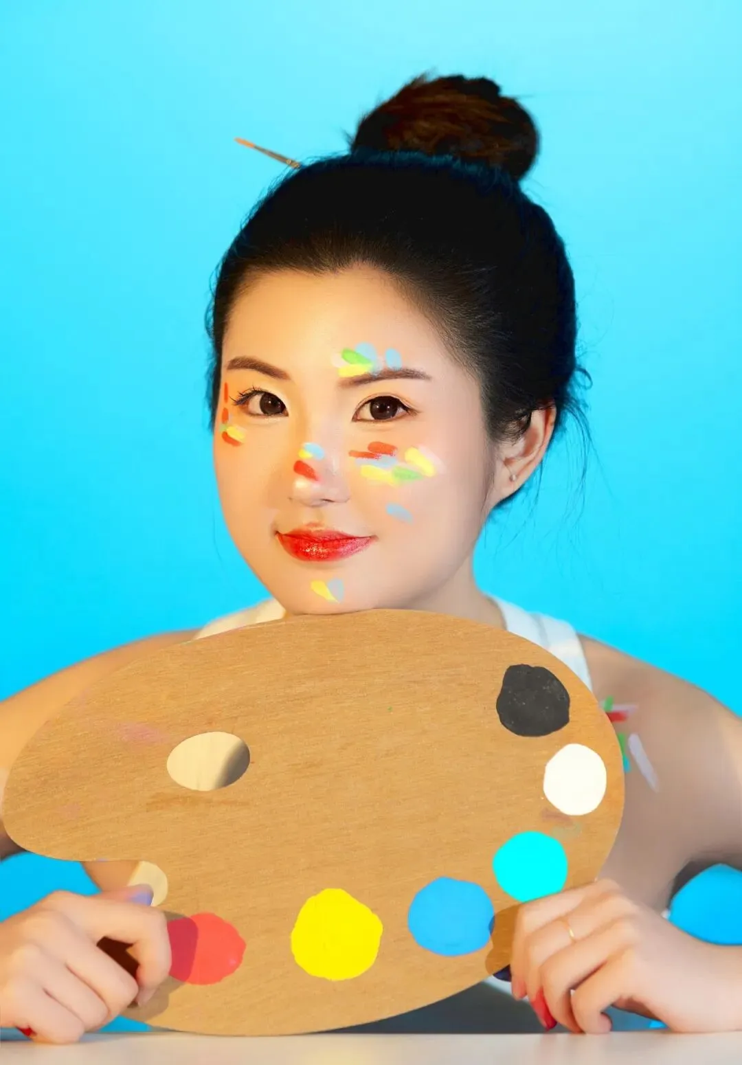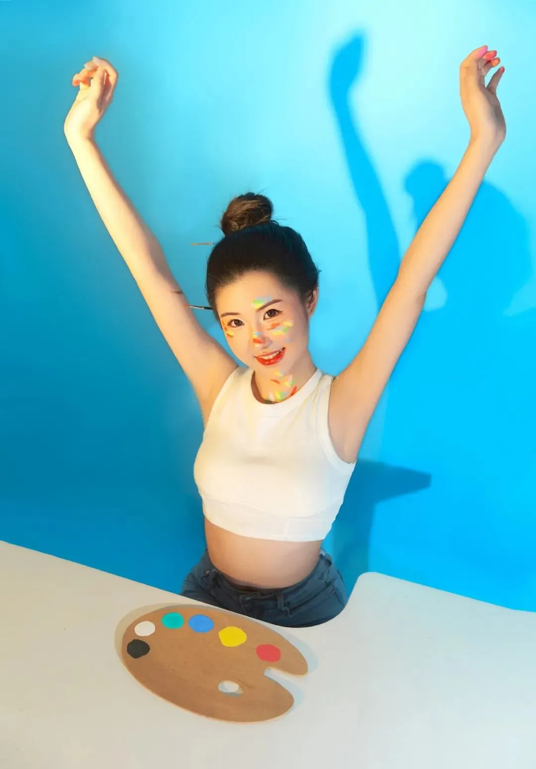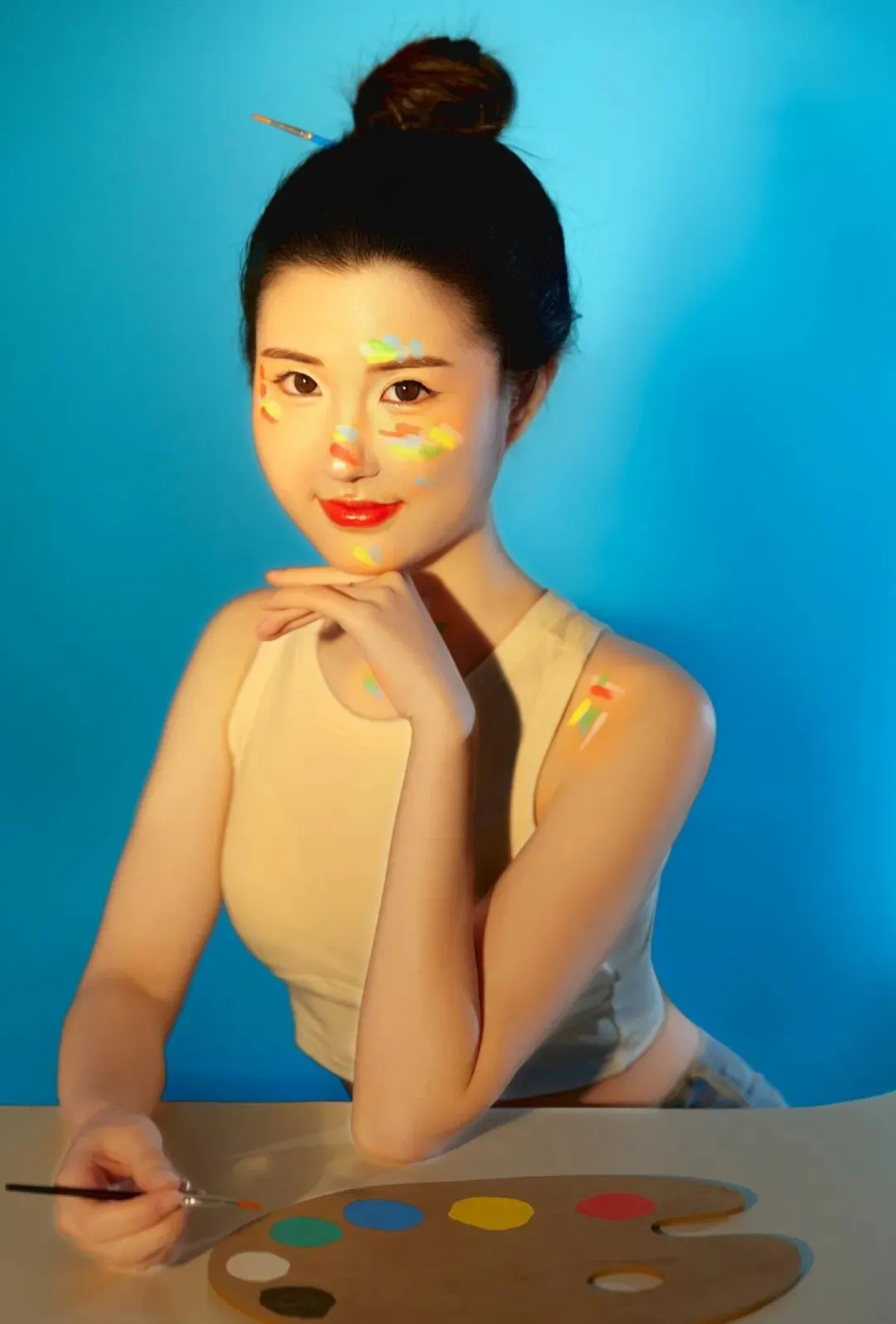 在艺术的浩瀚宇宙中,绘画是一颗璀璨的星辰,它以独特的魅力吸引着无数人投身其中,用色彩和线条描绘出内心的世界。今天,我们要认识一位怀揣着艺术梦想的年轻创作者,她手持调色板,笑容灿烂,仿佛在向我们诉说着绘画给她带来的无尽快乐与力量。画面中的女孩,将头发高高盘起,显得干练又充满活力。她身着简约的白色背心和浅蓝色牛仔裤,自然清新的装扮与她手中的调色板相得益彰。调色板上,红、黄、蓝、绿、黑、白等各种颜色的颜料整齐排列,仿佛是一扇通往多彩世界的大门。她的脸上沾染着星星点点的颜料,这看似不经意的点缀,却成为了她独特的“妆容”,彰显着她沉浸于创作时的专注与投入。绘画,对于她来说,不仅仅是一种技艺,更是一种情感的宣泄和心灵的对话。当她拿起画笔,蘸上颜料,在画布上轻轻挥洒时,仿佛整个世界都安静了下来。每一笔的勾勒,每一抹色彩的涂抹,都是她内心深处情感的表达。也许是一抹明亮的黄色,代表着她心中的阳光与希望;也许是一抹深沉的蓝色,诉说着她偶尔的沉思与忧郁。绘画成为了她与世界沟通的桥梁,让她能够将自己的喜怒哀乐毫无保留地展现在画布之上。