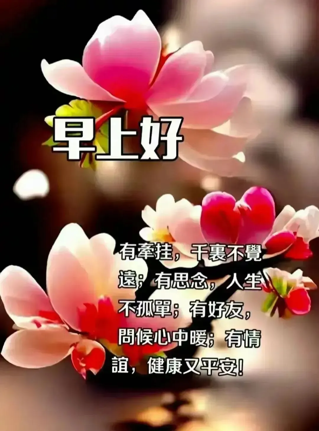 16,问候不怕遥远,祝福不挑时间,每天送上问候,表达我的心愿,让我们都健康平安!早上好!熟悉的声音,熟悉的笑脸,虽然不见,都在想念。愿我们彼此保重!每天都健康平安, 事事都如意!早上好!