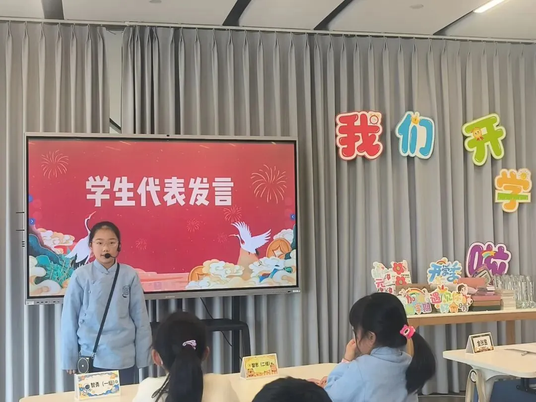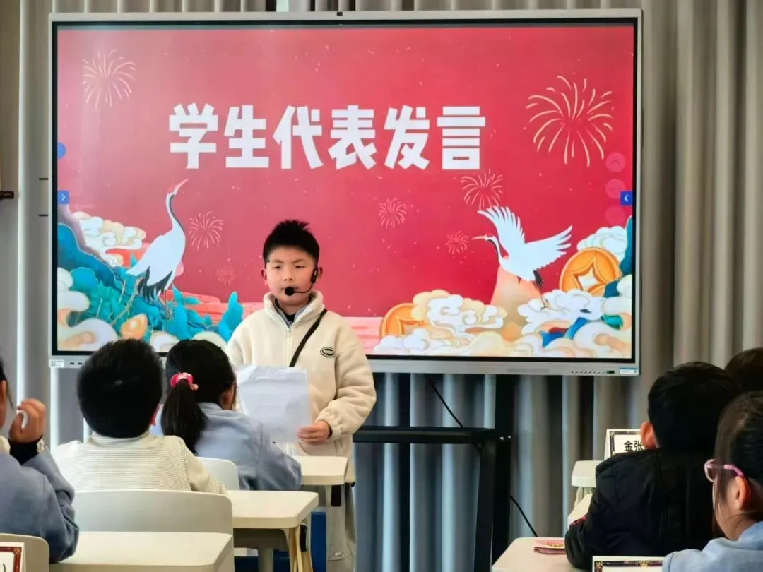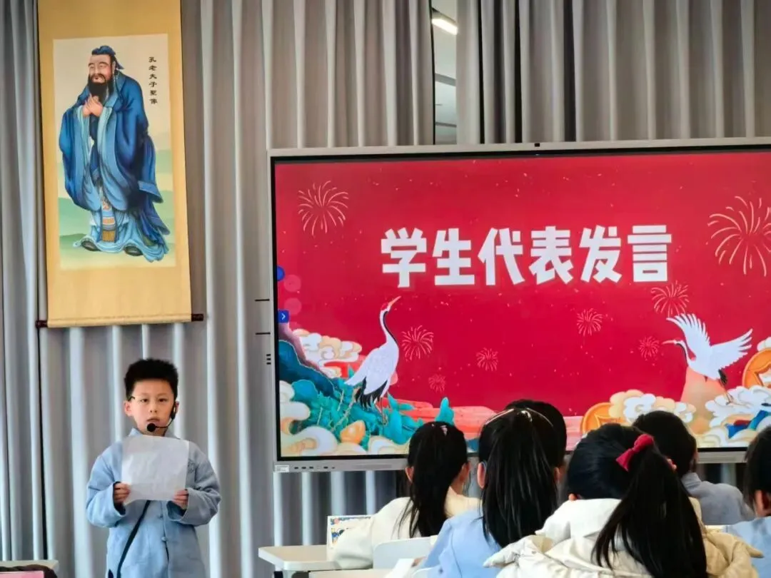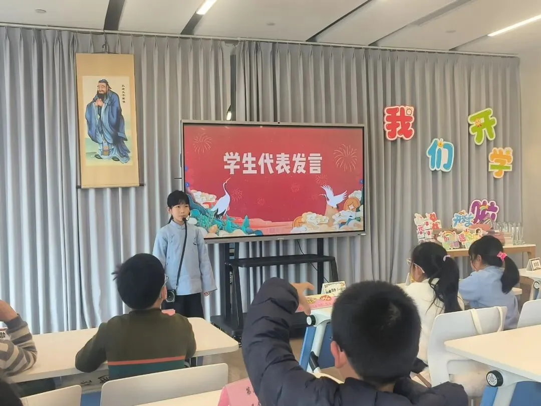 学生代表庄陆谊、廖芷恬、王杨滢、金张昱同学陆续登台发言,分享上学期学习经典的收获与感悟,感恩老师教诲、父母陪伴,许下新学期勤学笃行、传承文化的心愿,言语间满是对国学的热爱与对未来的期许。