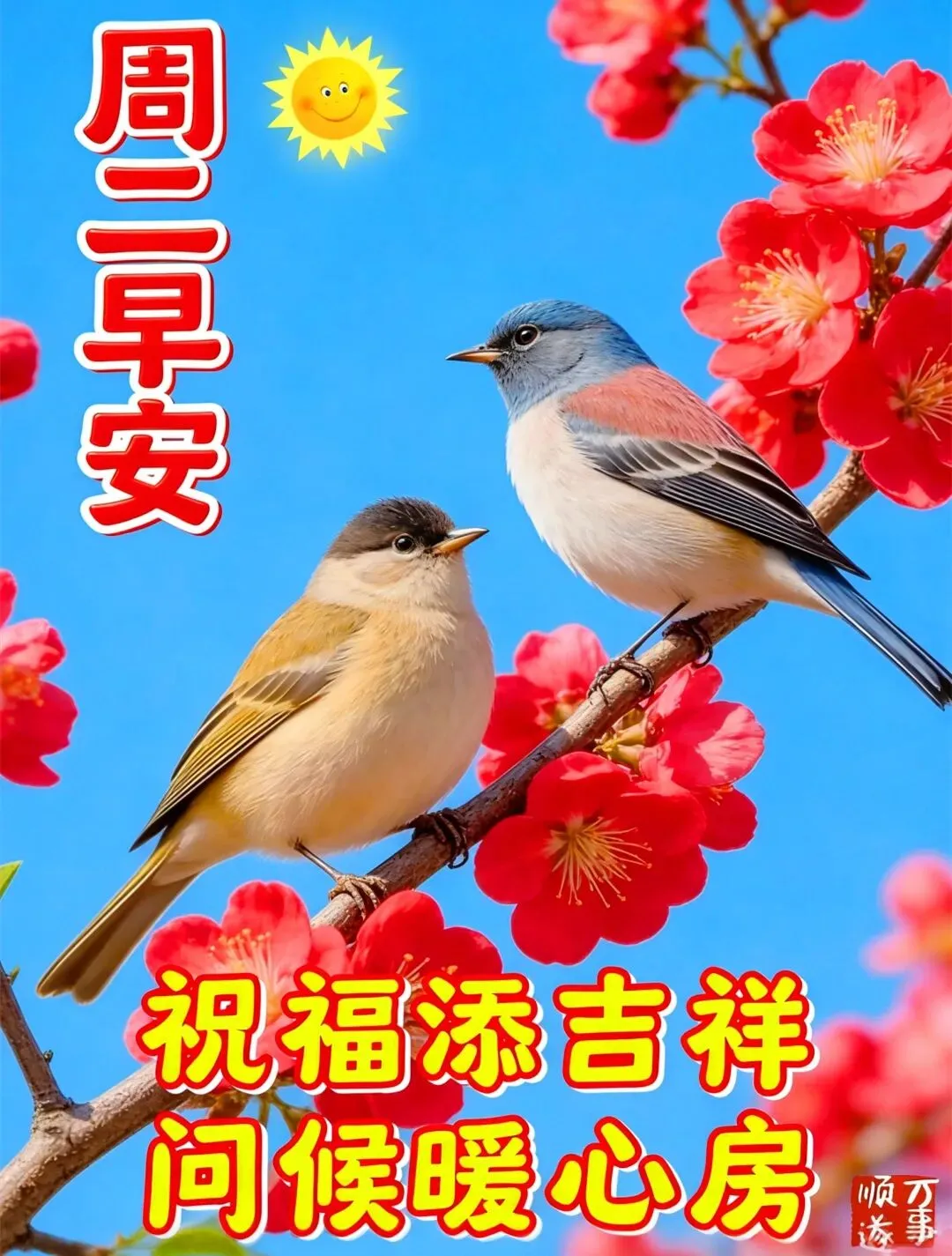 周二早安,春风送暖;清晨问候,情意最真。愿你平安喜乐常相伴,健康好运永相随,日子甜蜜舒心,生活幸福美满,岁岁平安,日日欢喜!早上好!