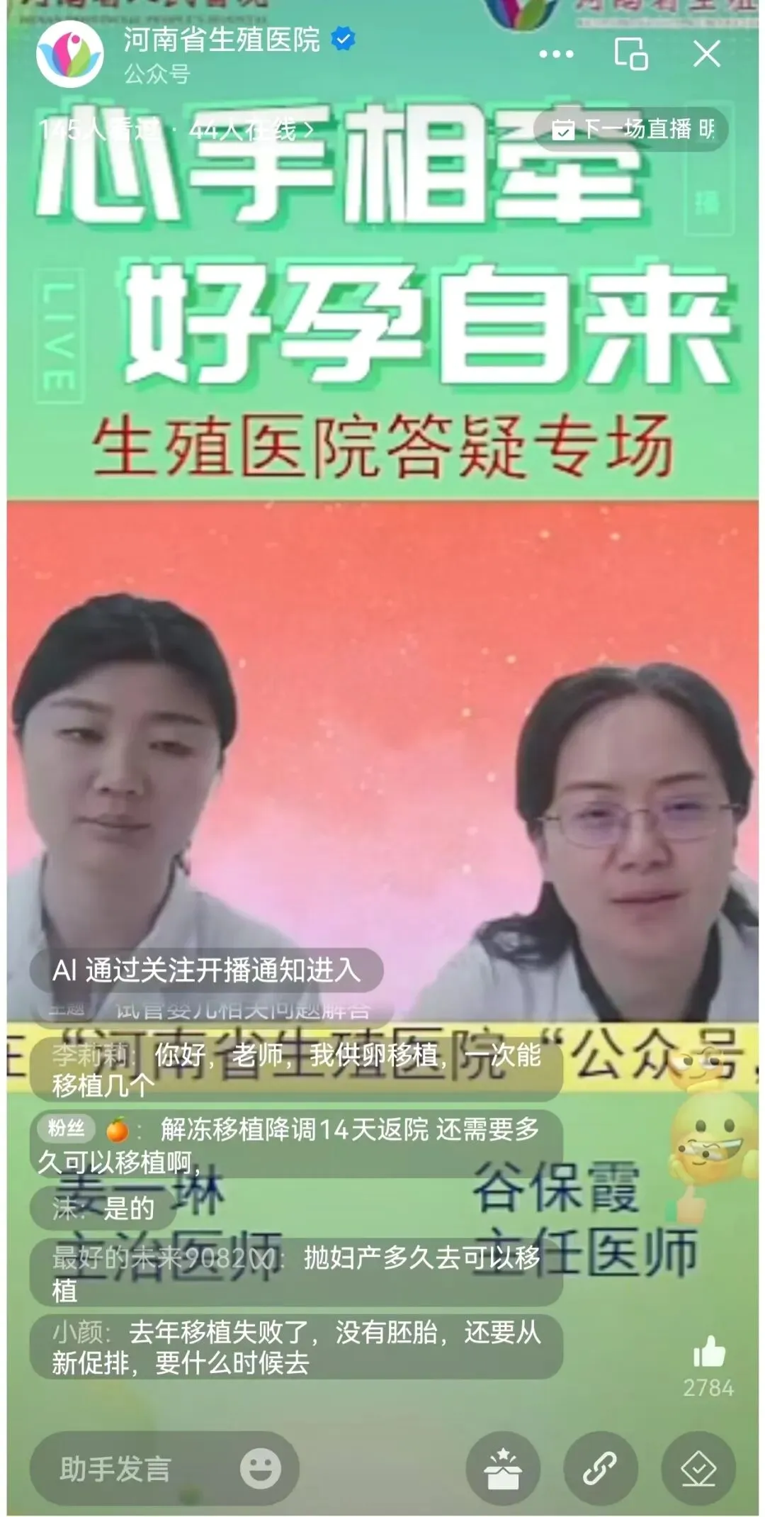 直播中,生殖中心的四位专家轮流上阵,从“备孕前的身体调理方案”“多囊卵巢综合征的助孕策略”到“胚胎移植后的注意事项”,逐一解答网友们的困惑。“我老公精液活力低,能做试管吗?”“复发性流产需要做哪些检查?”面对弹幕里层出不穷的问题,专家们耐心细致地一一回应,还结合真实病例进行分析,让专业知识变得触手可及。“本来还在犹豫要不要去医院,看了直播后不仅打消了顾虑,还抽中了免费超声检查,明天就去挂号!”一位来自洛阳的网友在直播间留言道。直播结束后,不少观众表示,这种“云端问诊”的形式既便捷又高效,希望以后能多举办类似活动。