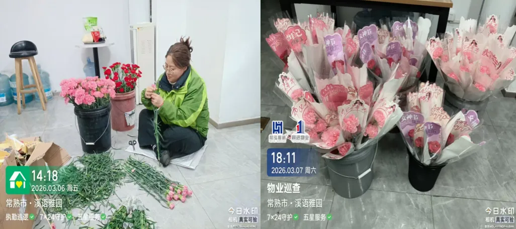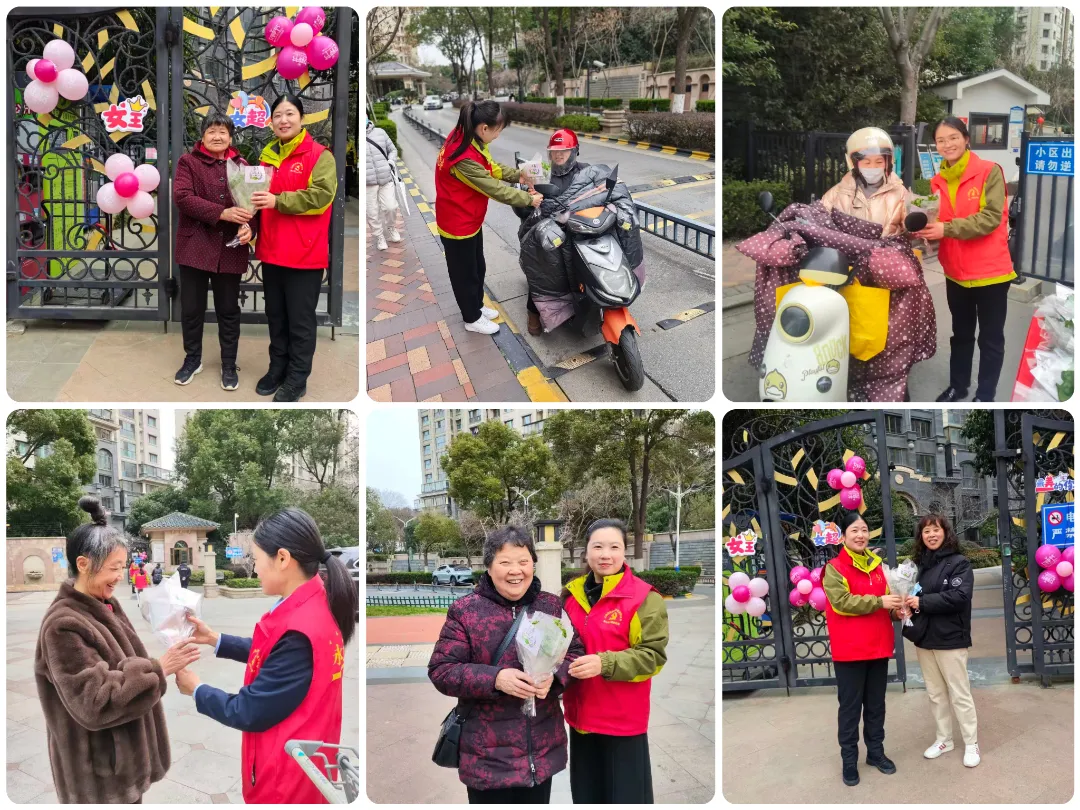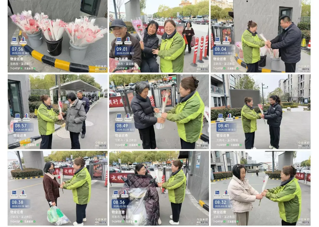 物业人员在主出入口、楼栋大堂及服务中心,为往来女性业主逐一送上包装精美的鲜花与节日祝福;同时向坚守一线的保洁、安保等女性员工致以诚挚慰问,感谢她们的辛勤付出。活动现场搭配“女神节快乐”主题海报,营造出温馨浪漫的节日氛围,收获了业主们的一致好评与温暖笑容。