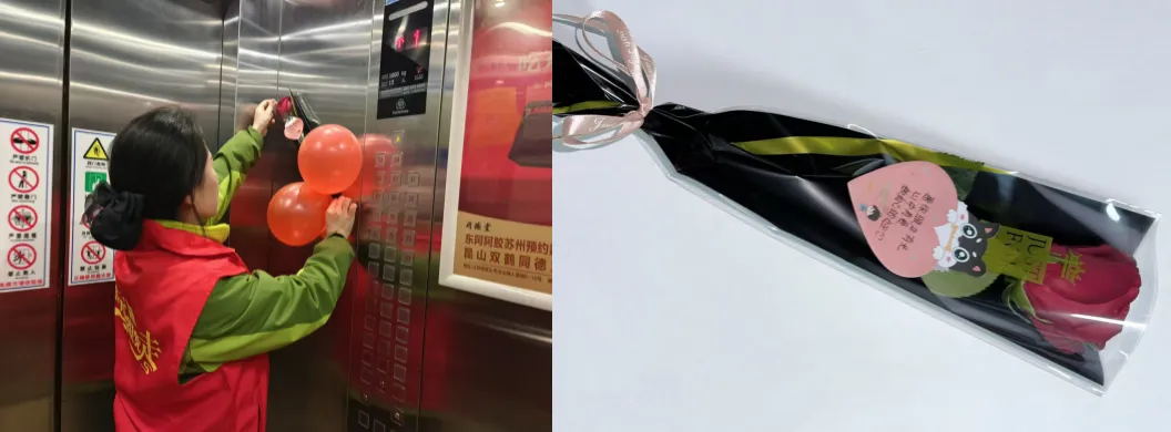 活动前期,物业中心的小姐姐们与安保人员分工合作在所有电梯里贴上了鲜红的玫瑰花,力求让每位女性业主感受到家一般的温暖,提升住在名俊豪庭的幸福感。