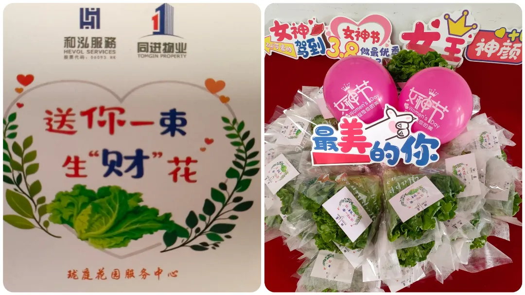 为确保活动顺利开展,物业服务中心各部门提前部署、紧密协作。精心制作200份创意生菜花束,以浅粉色包装纸细致包裹,搭配“生‘财’花,貌美又多财”主题卡片,寓意生活生财、生机盎然;提前搭建女神节专属打卡区,用粉色、玫红色气球打造温馨浪漫的背景墙,安装主题立牌,营造出浓厚浪漫的节日氛围。