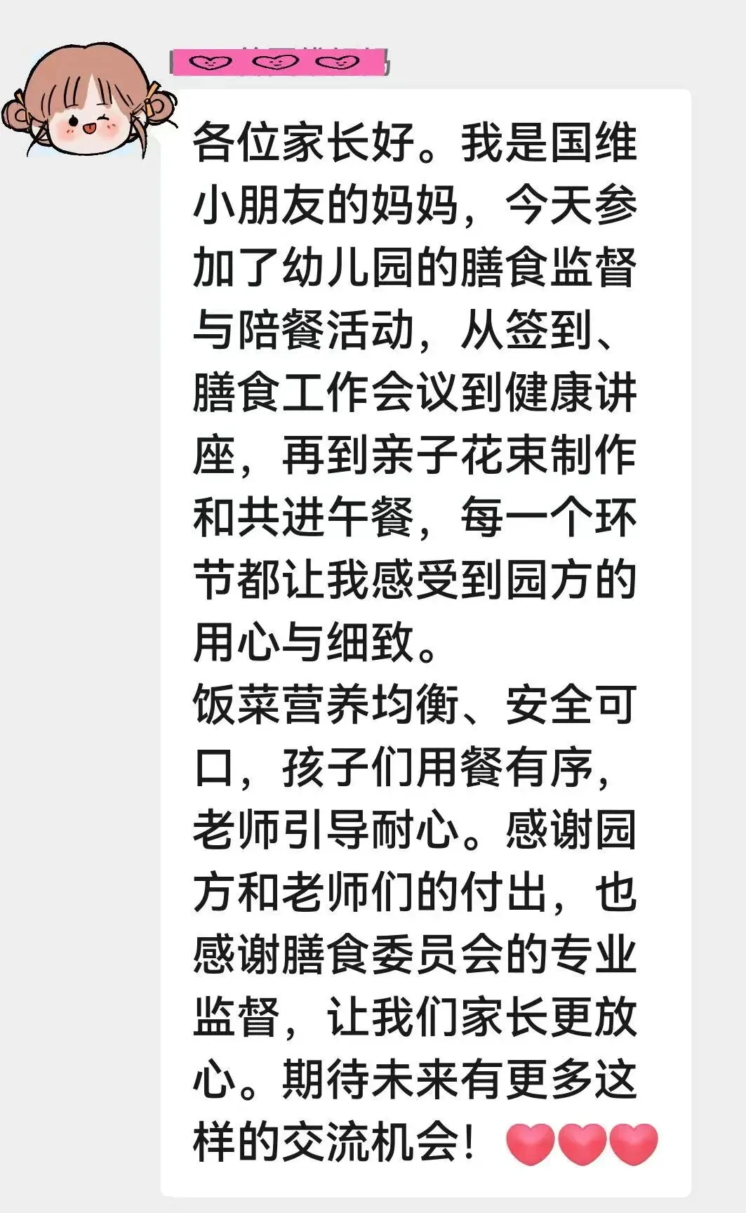 教育是一场美丽的邂逅,更是一场有爱有温度的同行。一次次膳委会的相聚,见证的是责任,传递的是担当,闪耀的是奉献。我们坚信,在家园同心、携手同行的努力下,必将凝聚起更强大的教育合力,共护幼儿成长,共育美好未来!