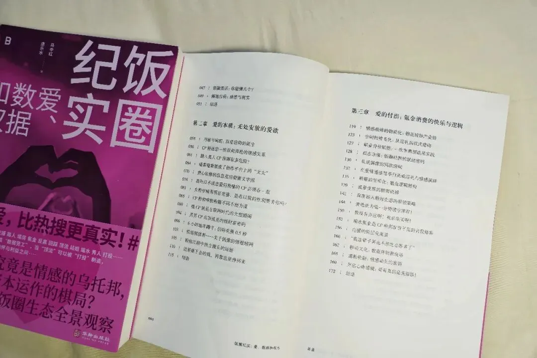 第一章《爱的启程:饭圈萌新历险记》记录饭圈新人的入圈体验,带出独立个体如何被编织进饭圈的精密大网,并对基础性的饭圈名词进行解释。第二章《爱的本质:无处安放的爱欲》聚焦CP粉的宇宙,发掘“我可以不谈恋爱但我嗑的CP必须在一起”背后的行动逻辑和心理机制。第三章《爱的付出:氪金消费的快乐与逻辑》以棉花娃娃、圣地巡礼、商务氪金等微观实践为切口,揭示饭圈经济背后的情感货币化机制。第四章《爱的表达:被数据绑架的爱》记录了秀粉是如何被以爱为名编织进一套以流量为核心的价值体系。第五章《爱的脆弱:偶像塌房危机》是全书情感最复杂的一个章节,它描述了个体如何在经历痛苦之后回到现实,重建信仰崩塌下的内心世界。