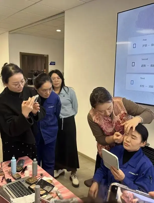 在美妆讲座的活动现场,授课老师从日常通勤淡妆如何快速上手为切入点,为大家进行了妆造的演示;从肤色底妆打造、眉眼精致修饰,到职场礼仪妆容禁忌、身形穿搭扬长避短,老师用通俗易懂的讲解结合实操演示,让零基础新人也能轻松掌握。