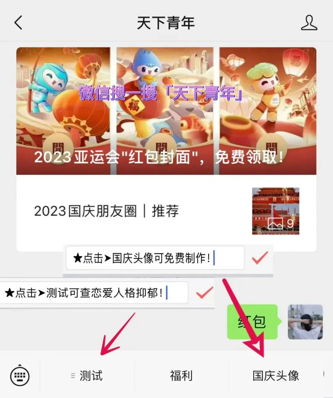 微信搜索#公众号:天下青年;并进入其主页。点击"国庆头像"