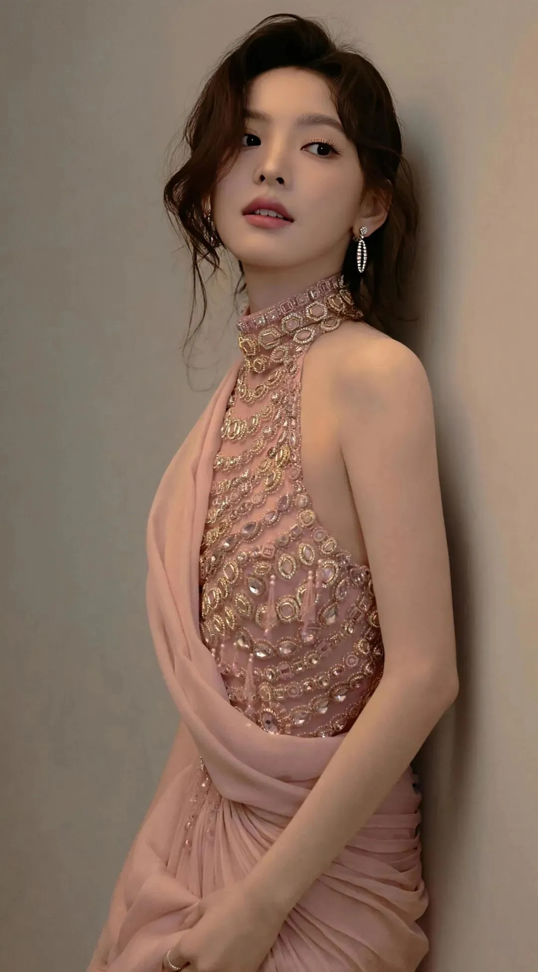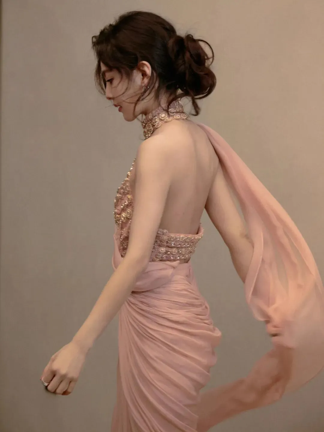 镜头下的她,身着一袭粉色蕾丝挂脖露背长裙,宛如从莫奈花园走出的玫瑰精灵。