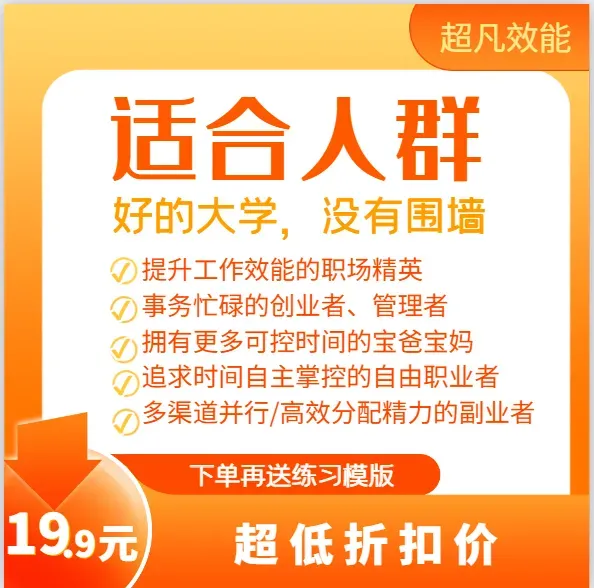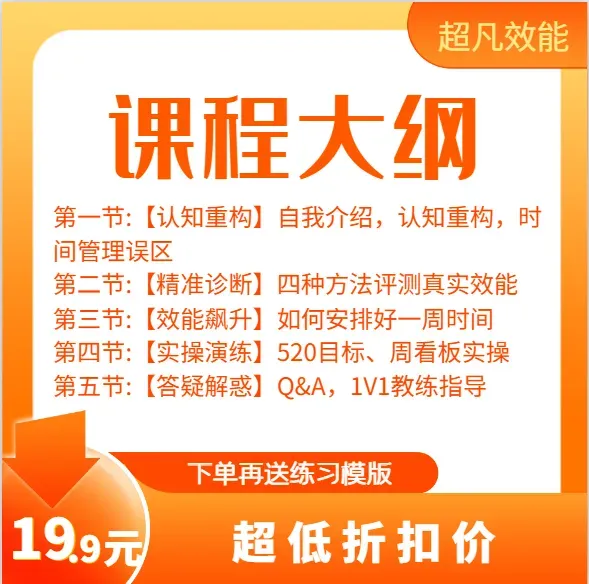 专为零基础、想改变却无从下手的朋友设计!5节精华课,帮你:✅ 厘清时间黑洞,找回丢失的专注力✅ 掌握简单易行的计划制定法(告别复杂表格!)✅ 建立优先级思维,告别“瞎忙”✅ 克服拖延小技巧,立刻行动不内耗✅ 打造专属时间表,让每一天清晰可控