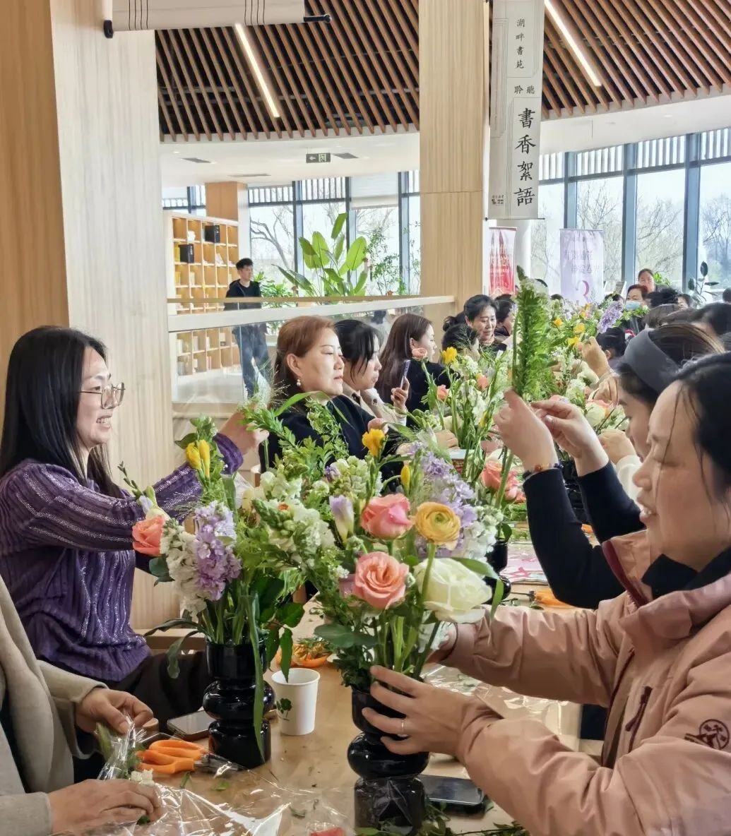 湖畔书苑携手资深花艺讲师,在3月7日,3月8日连续举办了三场插花沙龙。每一场活动中,书苑的阅读区都化身为花的海洋,仿佛书页间流淌的文字,化作了枝头绽放的诗意。