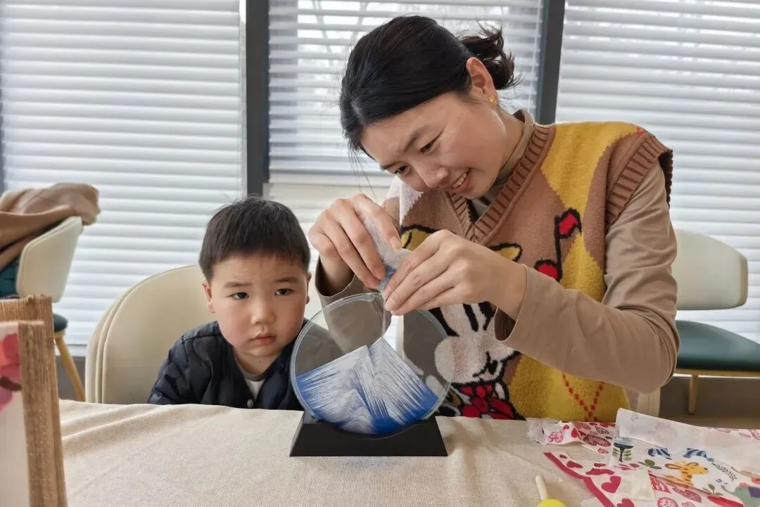 紧接着是流沙画制作。彩色的细沙、透明的玻璃框、流动的胶液……每一次翻转,都是一幅全新的画面,仿佛将春日的灵动与诗意凝固在了方寸之间。