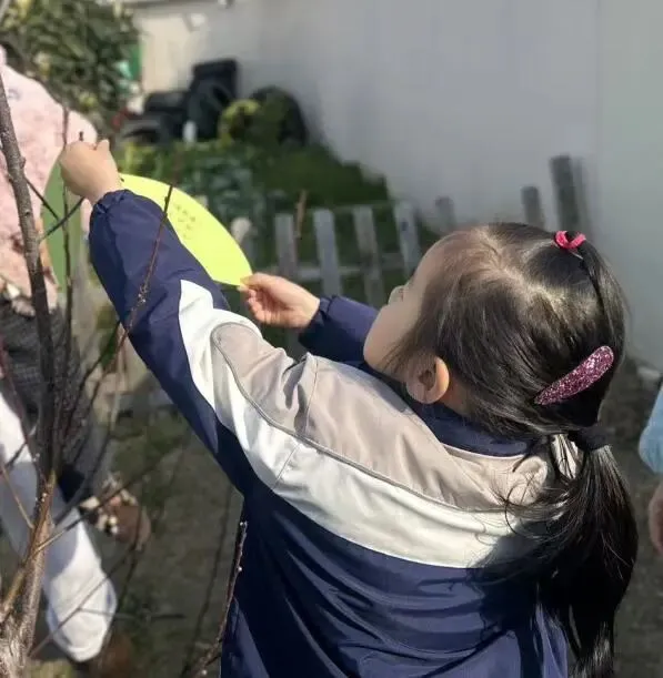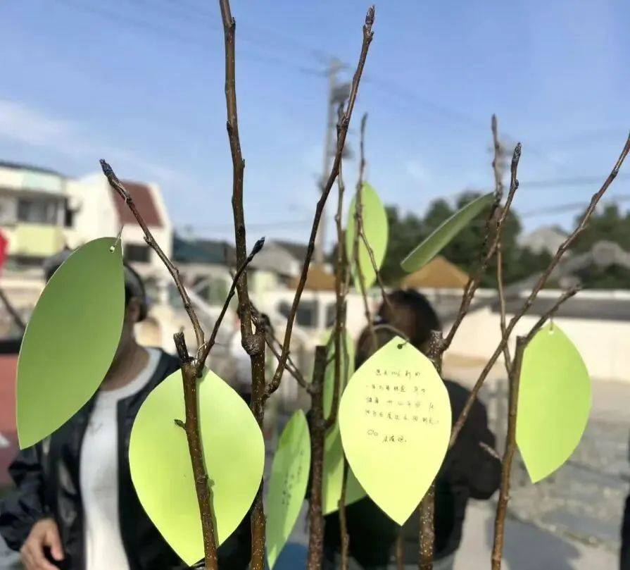 主持人介绍完活动流程,女神与孩子们自由选座,领取一张绿色树叶形状卡片,写下对自己和孩子的祝福,然后亲手将这片满载着心意的树叶挂在了幼儿园的桃树上,让爱与希望共同汇聚成一颗生机盎然的大树!