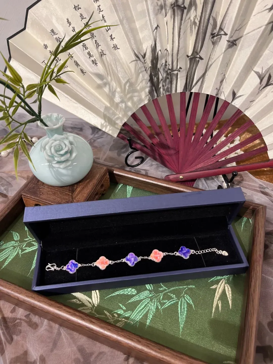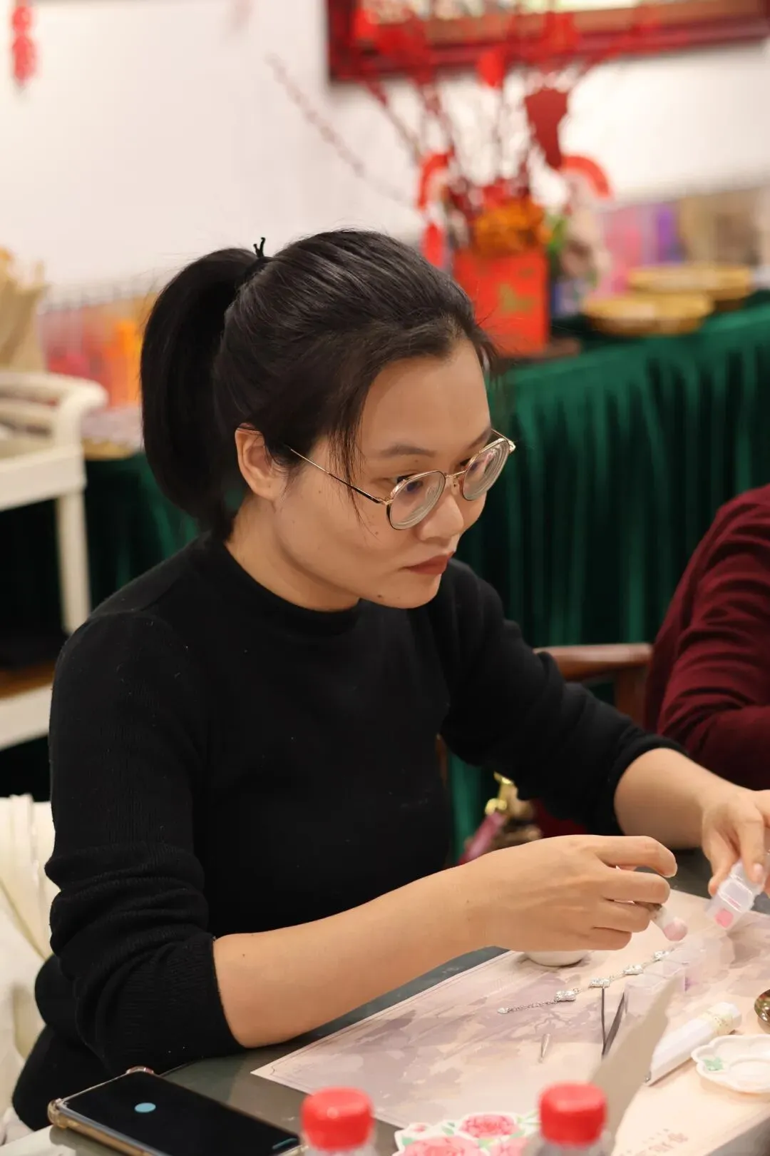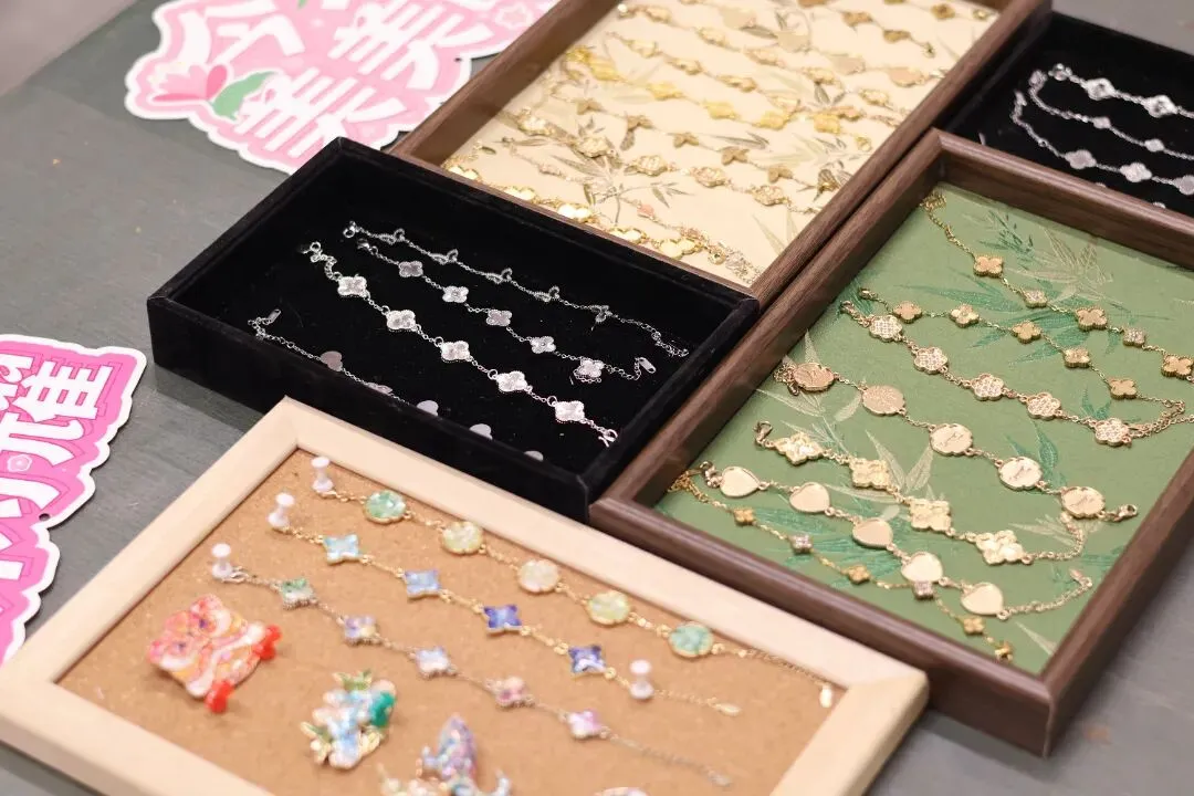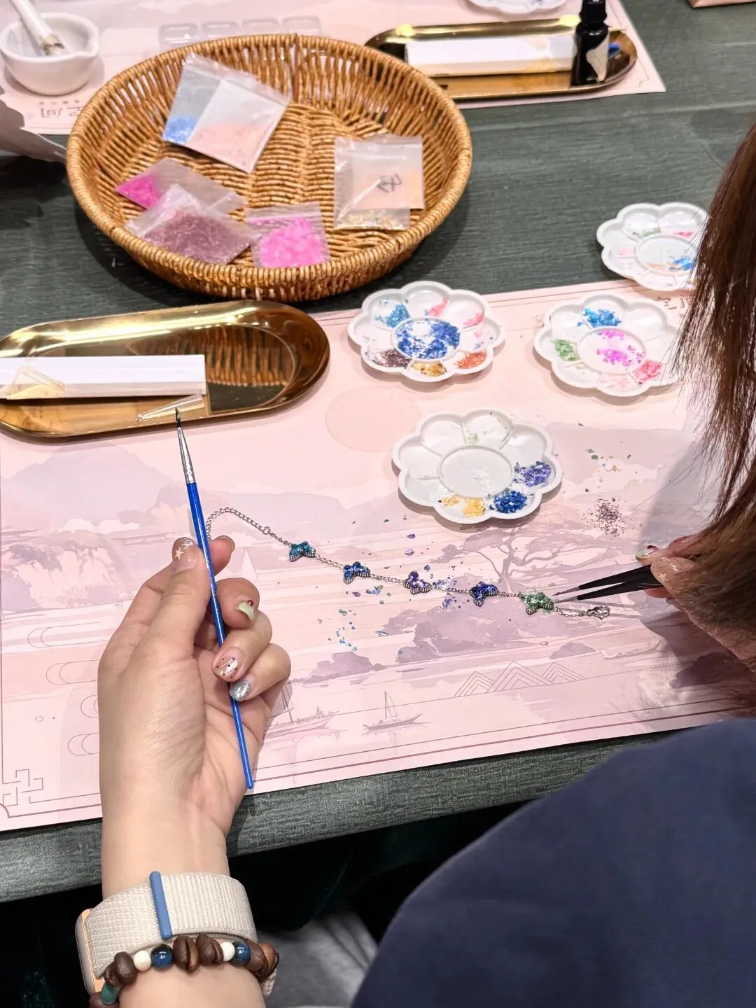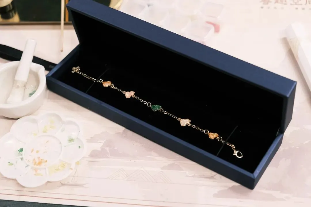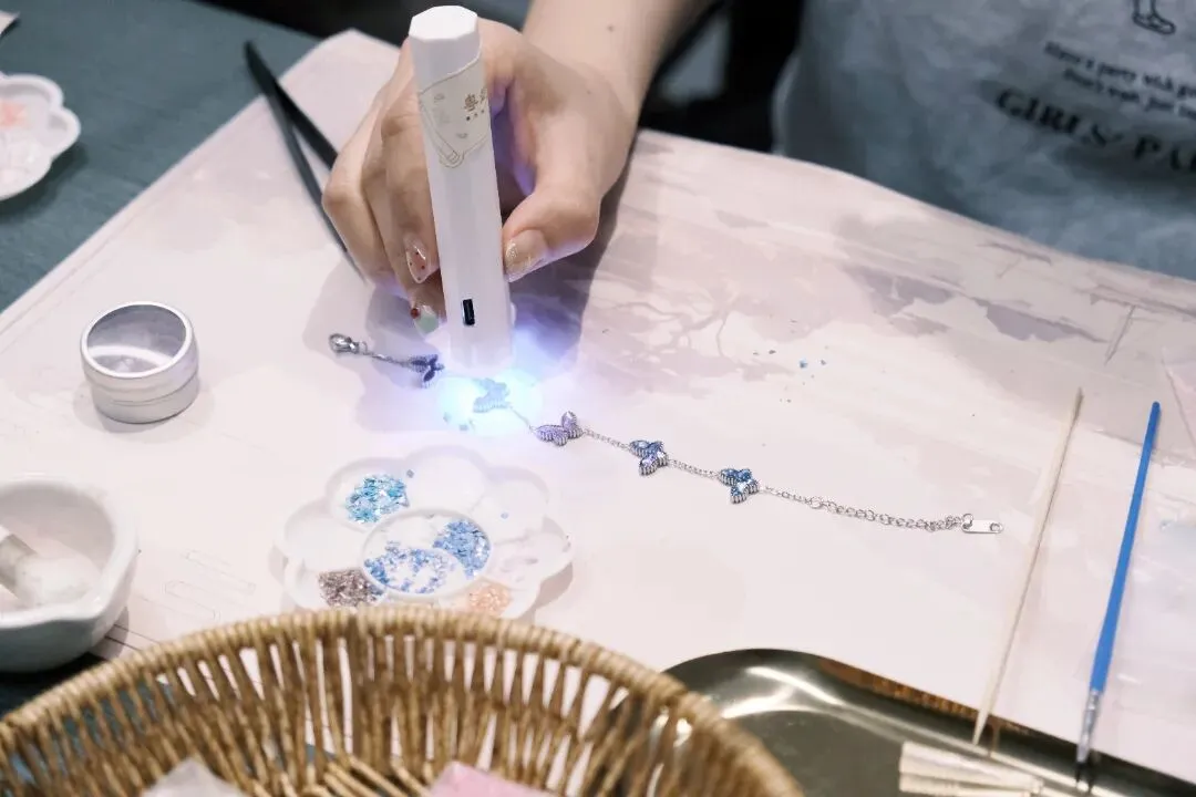 活动现场气氛热烈而温馨,大家时而低头沉思构思图案,时而相互探讨配色技巧。平日里奋战在各个岗位的“女神”们,此刻纷纷化身“匠人”,小心翼翼地拿起工具,将一片片薄如蝉翼的螺钿片镶嵌在手链底托上。一条条独具匠心、色彩斑斓的螺钿手链逐渐在大家手中诞生。