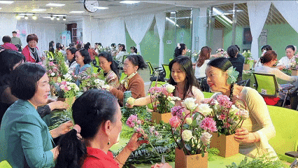 学员们沉浸在淡淡的花香里,一边学习插花,一边轻松聊天,所有烦恼都烟消云散。