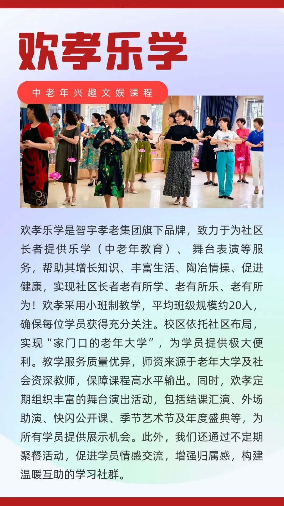 “欢孝生活家”是智宇孝老集团旗下专注服务长者的核心品牌。我们以“互联网平台+生态”为核心模式,致力于构建一个覆盖品质生活、旅游旅居、健康管理与社交关怀的社区康养生活服务生态圈,为长者和家庭提供全方位、有温度的服务支持。我们不止提供单一服务,更希望陪伴每一位长者,在社区里享受安心、健康、温暖的退休生活。