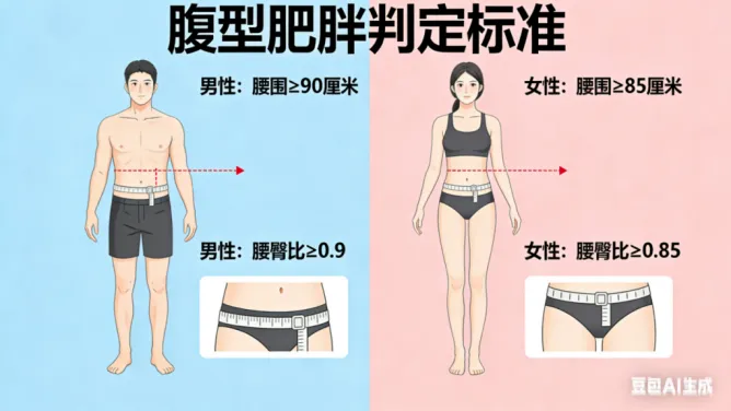 腰臀比超标=中心性肥胖(腹型肥胖),意味着脂肪堆积在腹部,对心脏压力极大。