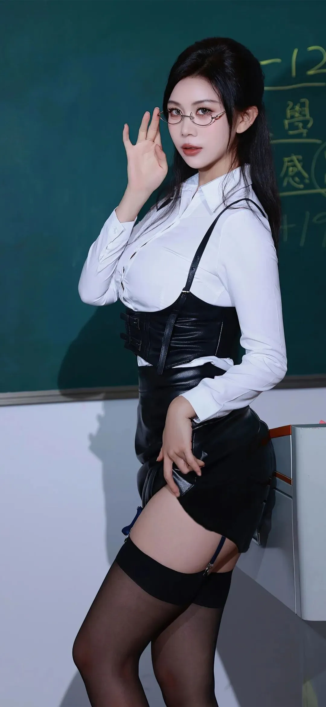 金丝眼镜的加持,让整体气质更添一分清冷与知性。镜片后的眼神带着故事感,单手轻提高跟鞋的动作慵懒又随性,将御姐的自信与从容展现得淋漓尽致。背景里的黑板与讲台,本是充满书卷气的场所,却在她的演绎下,变成了氛围感的绝佳衬托,这种 “反差感” 的碰撞,瞬间击中人心。