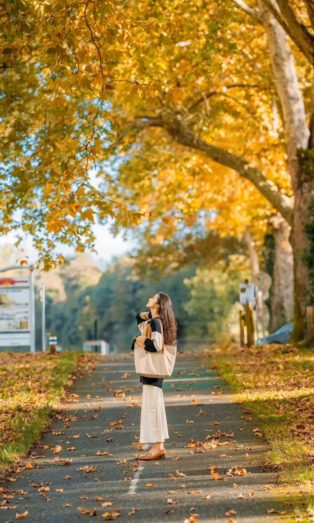 侧身站在步道上,双手轻抱托特包,仰头看向上方的黄叶,身体微微侧转,背景是金黄行道树与落叶,姿势舒展又治愈,氛围感拉满。
