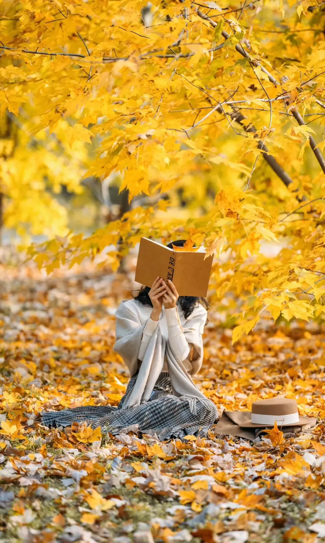 侧身坐在林间落叶上,双手轻握书本遮脸,身体微微侧转,背景是金黄银杏与落叶,显松弛又有格调,像不经意被抓拍。