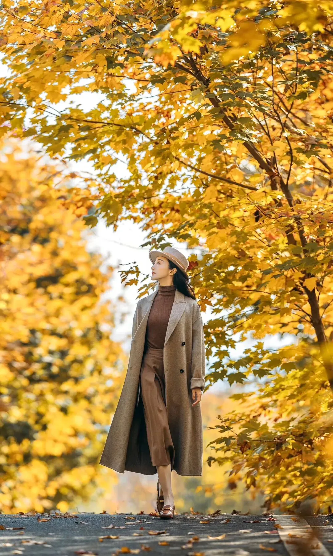 单手轻插衣兜,侧身走在步道上,身体微微侧转,背景是金黄银杏与街景,温柔又有故事感,显耐看又有个性。