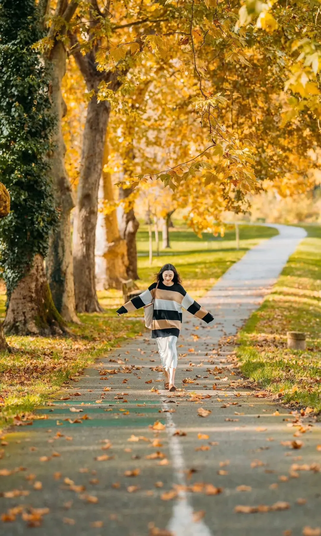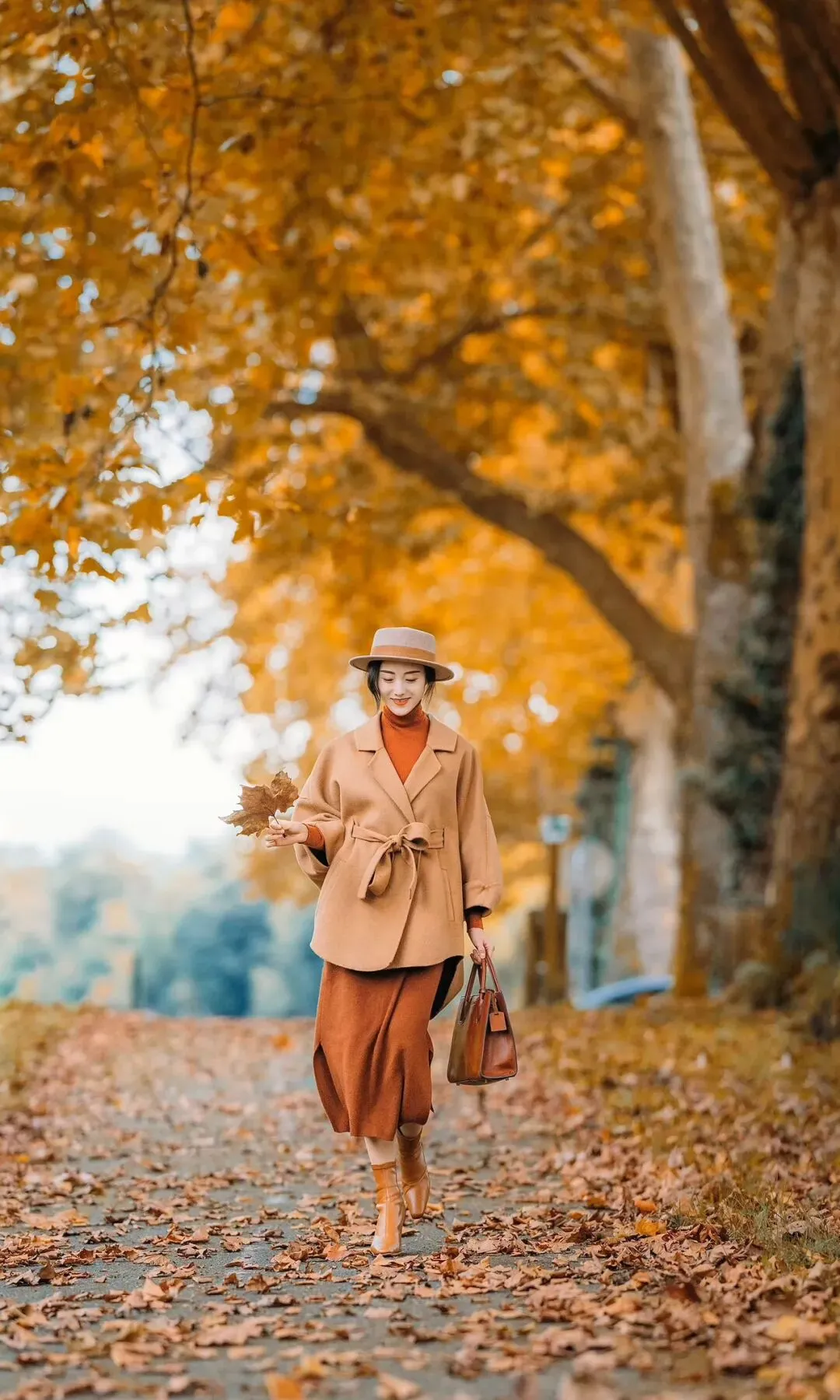 单手轻握枫叶,一手提包,侧身走在步道上,身体微微侧转,背景是金黄行道树与落叶,俏皮又有细节,显灵动又有态度。
