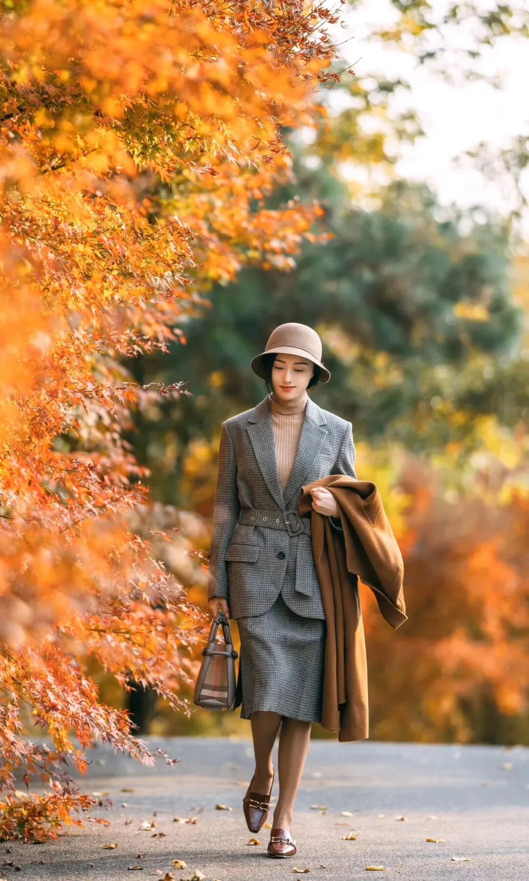 单手轻抱外套,一手提包,侧身走在枫树下,身体微微侧转,背景是红枫与街景,显元气又自然,治愈感十足。
