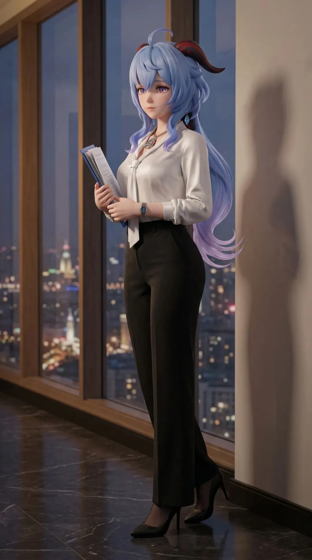 当蓝色麒麟走下绝云间,换上现代都市的简约通勤装。她侧身倚在落地窗前,城市的璀璨夜景在她身后化作流光。白色真丝飘带衬衫、黑色高腰阔腿裤,那双标志性的紫色眼眸中,依然是那份属于月海亭秘书的温柔与认真。
