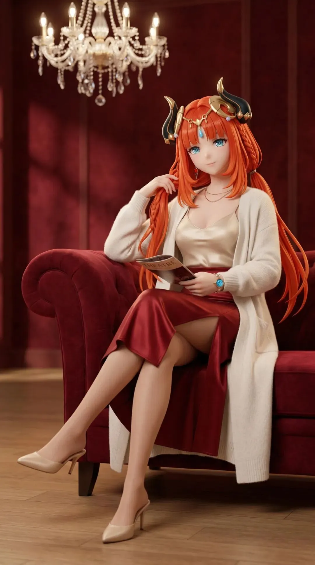 她手持节目单,轻轻拨弄着发丝,那双清澈的蓝色眼眸温柔地看向你。柔和的暖光洒在她精致的角饰和橙红色长发上,仿佛整个午后都因她而变得浪漫。