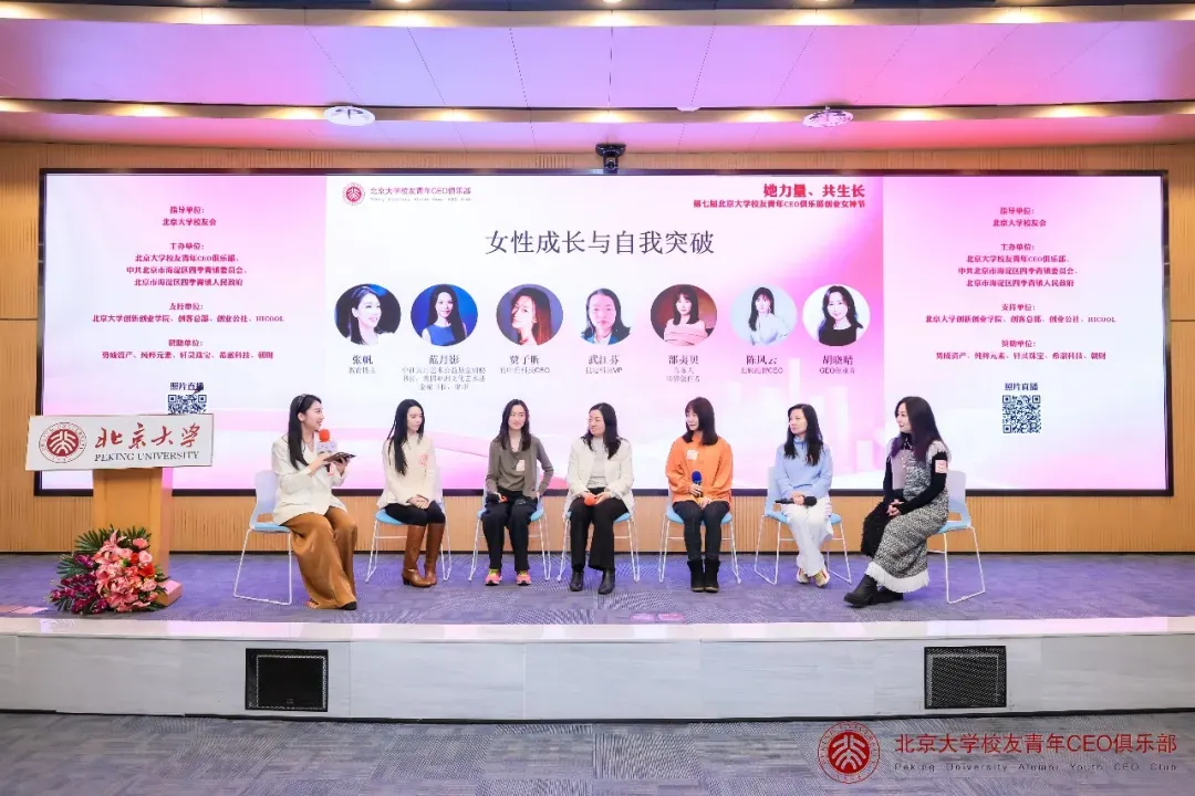以“女性成长与自我突破”为主题的圆桌论坛精彩开启,由教育博主张帆担任主持,中社黄月艺术公益基金副秘书长范月影、竹昕岳科技CEO贾子昕、昆迈科技VP武江芬、音乐人&跨界创作者邵夷贝、北软融智CEO陈凤云、GEO创业者胡晓晴等六位嘉宾齐聚,围绕起点与选择、破茧与转身、力量与平衡、向善向上四组关键词展开深度交流,嘉宾们结合自身经历,分享创业抉择、跨界转型、女性领导力、精力管理、公益向善等实战感悟与成长心得,展现了北大女性创业者敢闯敢拼、坚韧通透的风采,为女性成长与创业突破提供了宝贵思路,传递出温暖且坚定的巾帼力量。