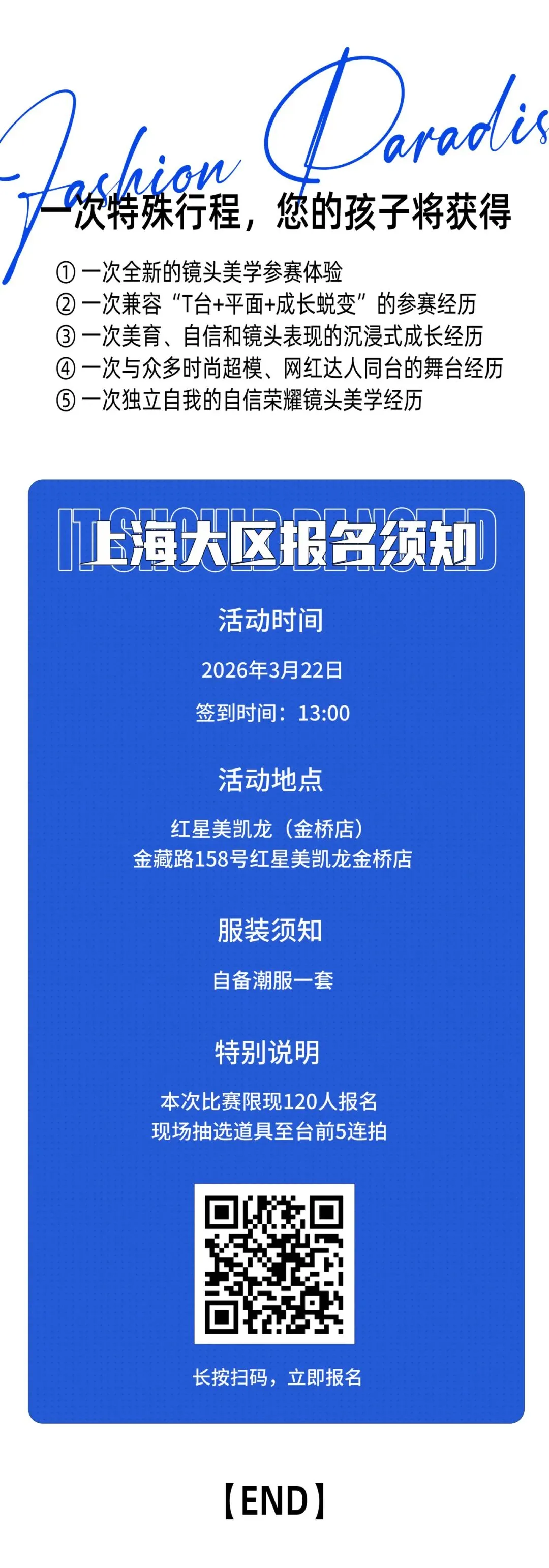 运营团队具有八年赛事操盘经验,从报名咨询、赛前指导到赛事拍摄、结果公示,全流程标准透明。拍摄现场配备舒适休息区、儿童游乐角,家长省心,选手安心,让参赛成为一次轻松愉快的时尚体验!