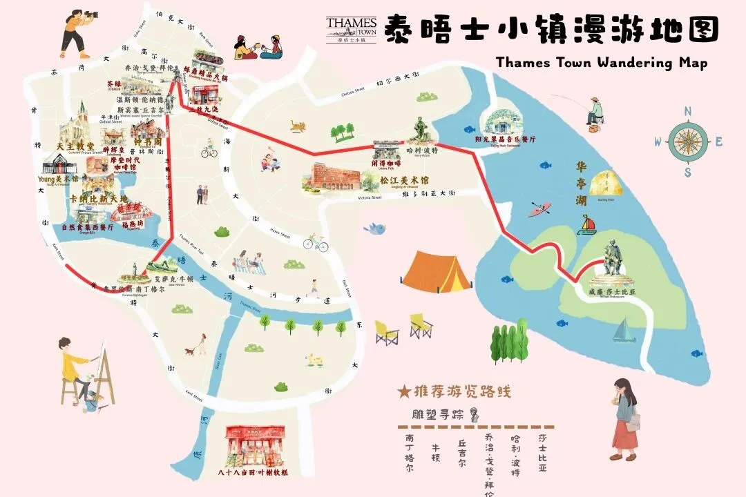 泰晤士小镇核心区域涵盖海斯大街、肯特大街、苏荷大街及伯克大街等,周边分布着英式住宅、教堂,各处点缀形态各异的雕塑,尽显独特韵味。