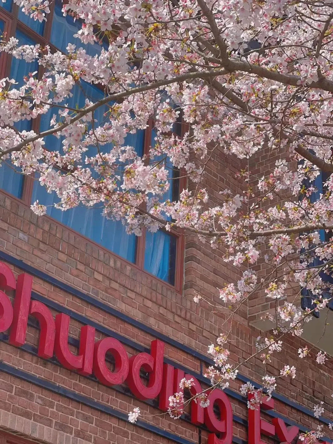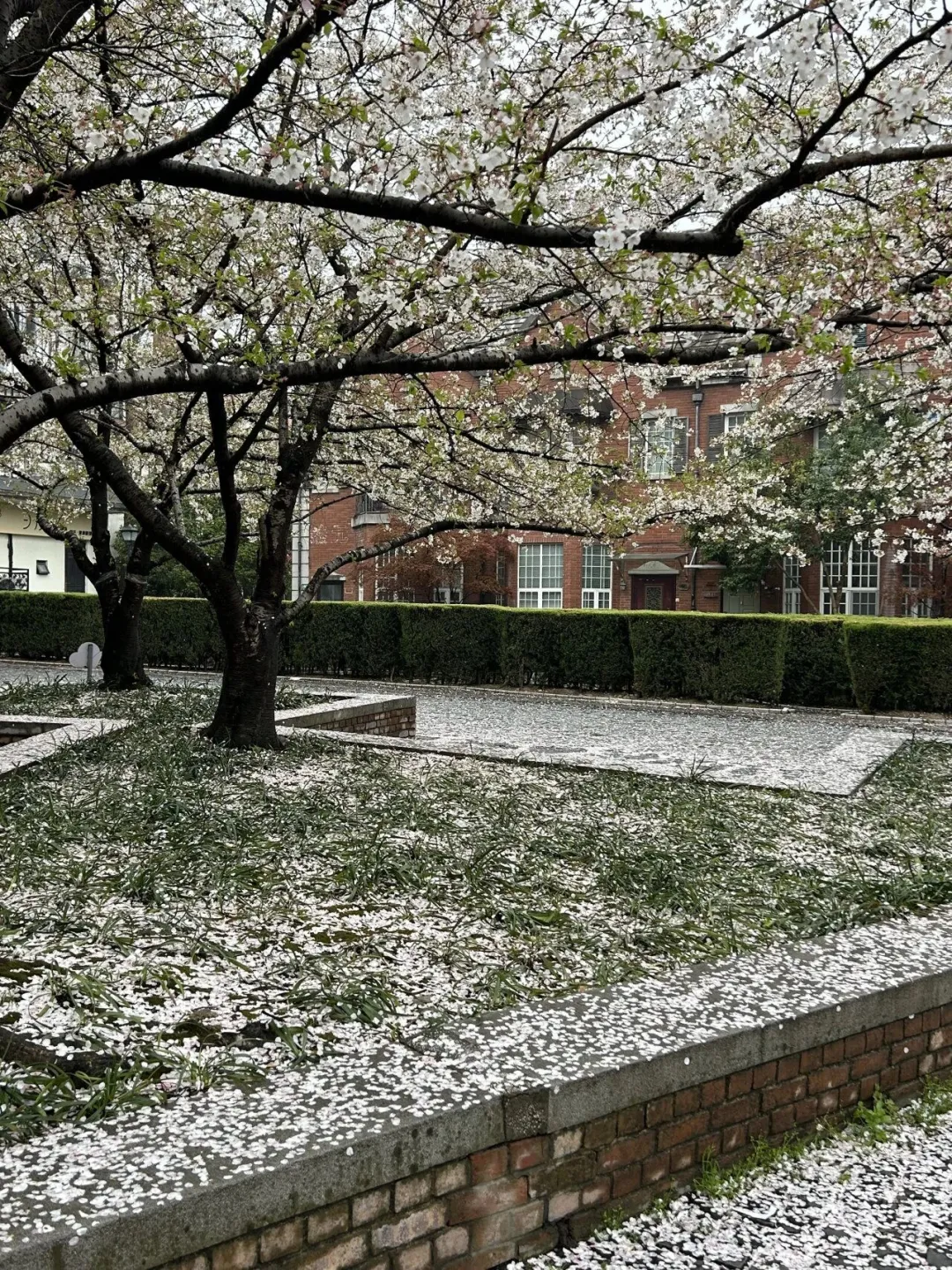 这里是小镇里樱花最集中的区域之一,图中的红砖建筑、老虎窗、烟囱和石板路,正是泰晤士小镇典型的英式联排别墅风貌,有几棵高大的樱花树与红砖维多利亚式排屋完美同框,是春季拍英伦风樱花的热门机位!