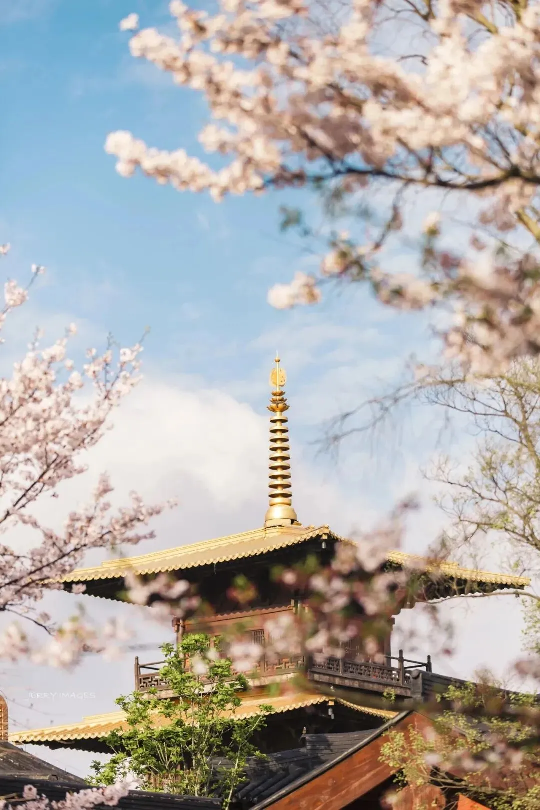 春天时,塔周围的染井吉野樱盛放,从知也禅寺外侧或樱花步道上,就能拍到樱花枝桠与塔檐、金顶同框的经典画面,是必拍的 “红墙金塔 + 粉樱”。
