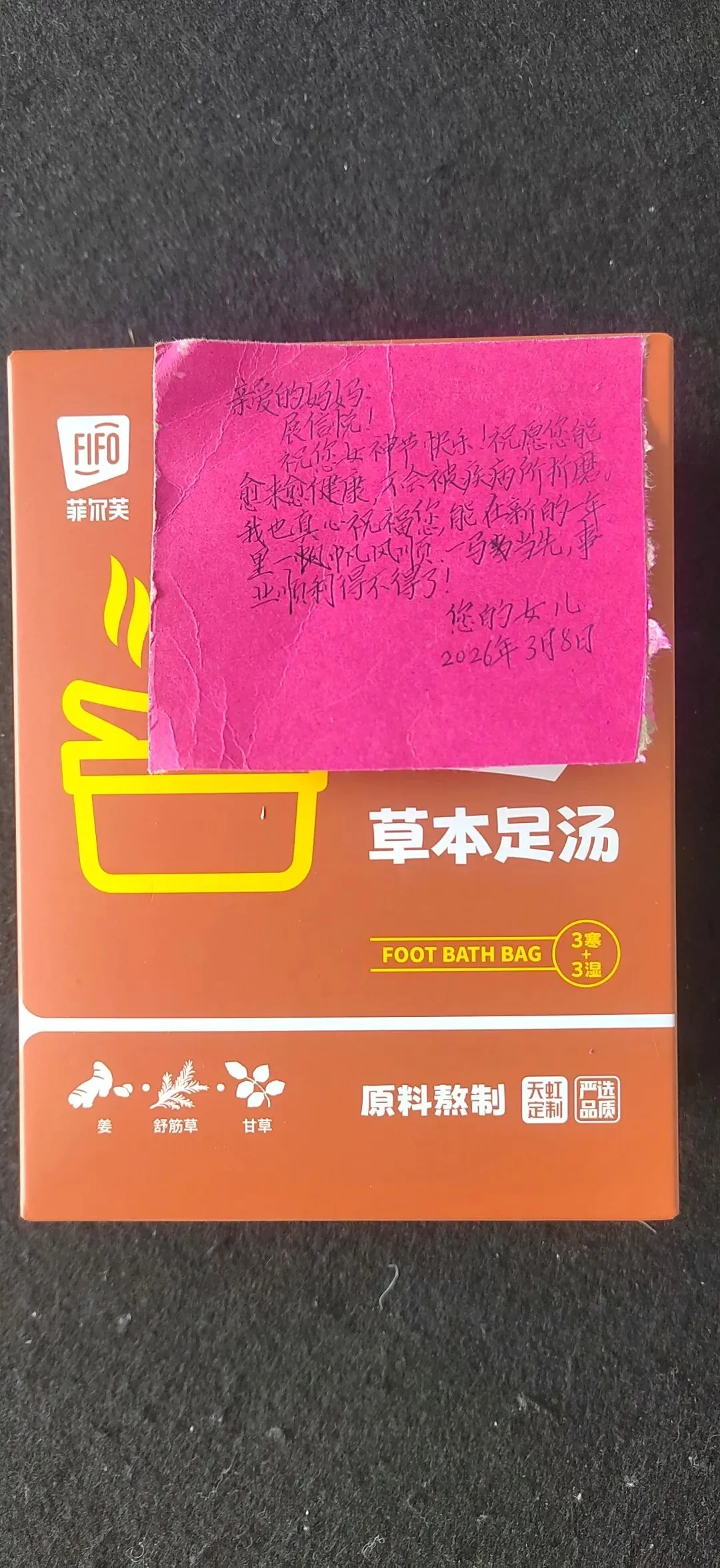 包装盒上贴着一张红色小纸条,歪歪扭扭写着几行字,特别引人注目。那是女儿的笔迹,一笔一画都认真得过分,像在完成一件天大的事。