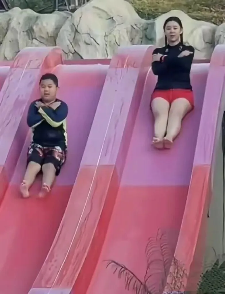 人到中年,“幸福胖”也常见。还有李小萌和大儿子玩水上滑梯的画面,她身材丰腴饱满、大粗腿很抢镜,看体型和大儿子简直一模一样。