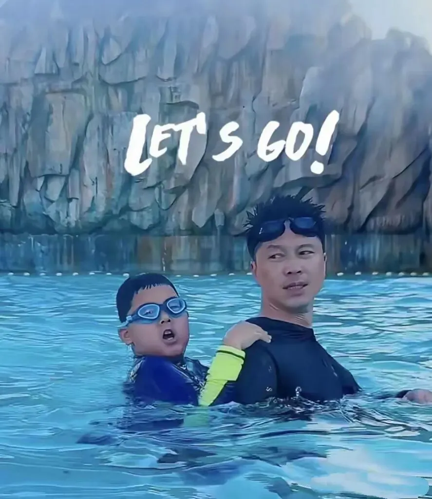 李小萌穿黑色泳衣,把头发扎起来梳了一个大背头,她的脸型很精致也不显胖。只不过肩膀、手臂的位置,暴露了日益丰满的体型。